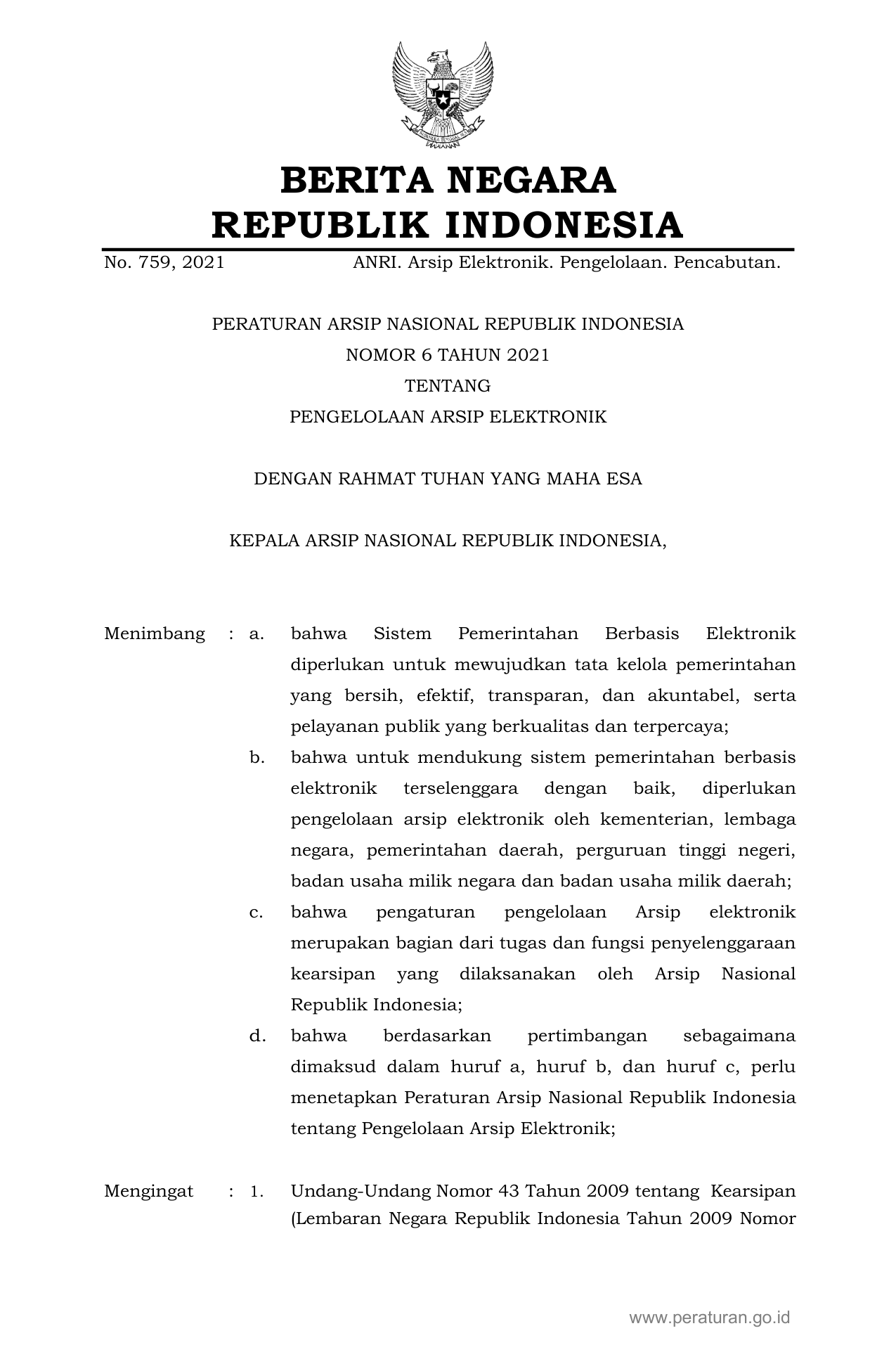 PERBAN Nomor 6 Tahun 2021 | Peraturan Badan Nomor 6 Tahun 2021 tentang PENGELOLAAN ARSIP ELEKTRONIK