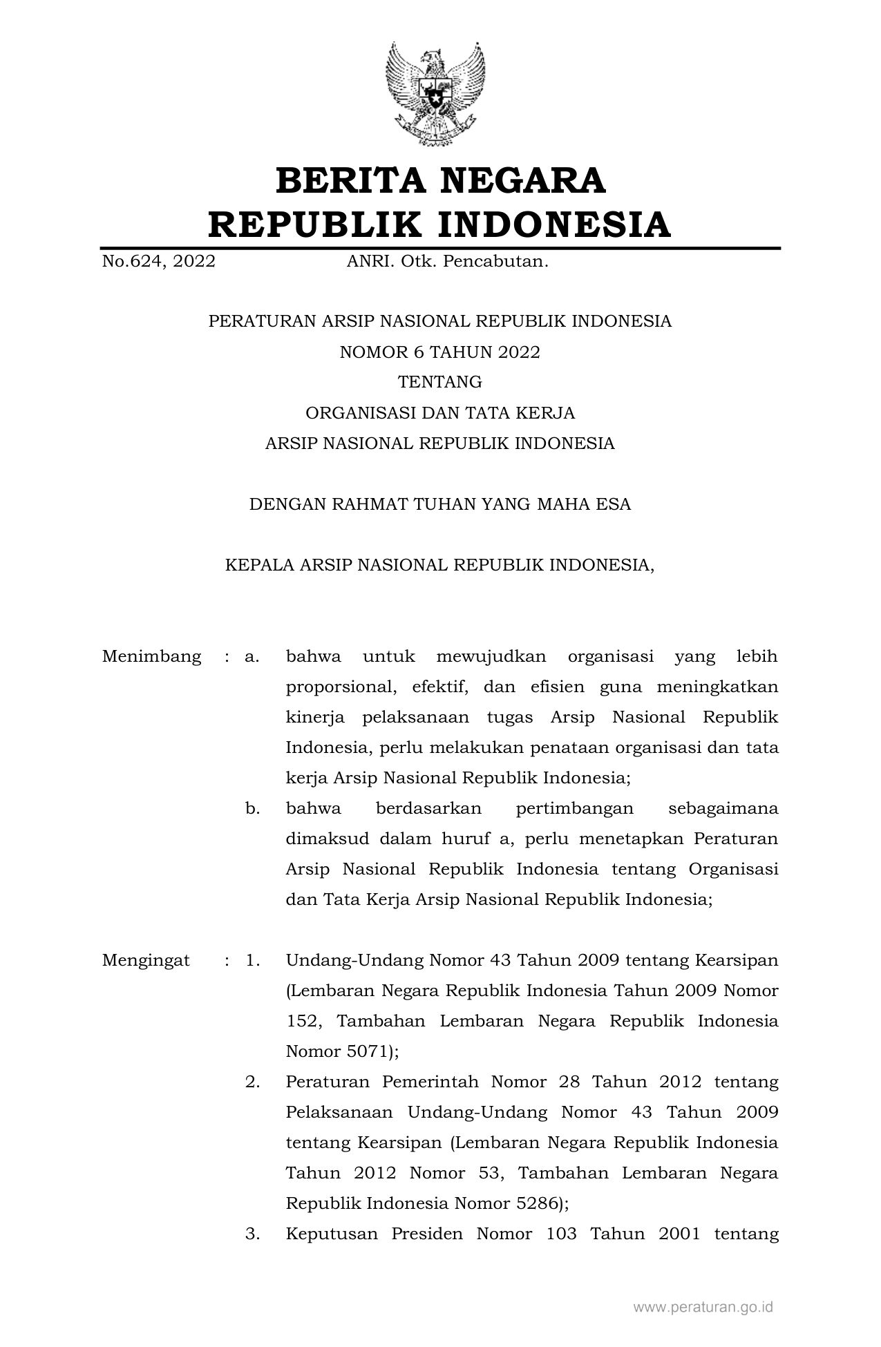 PERBAN Nomor 6 Tahun 2022 | Peraturan Badan Nomor 6 Tahun 2022 tentang ORGANISASI DAN TATA KERJA ARSIP NASIONAL REPUBLIK INDONESIA