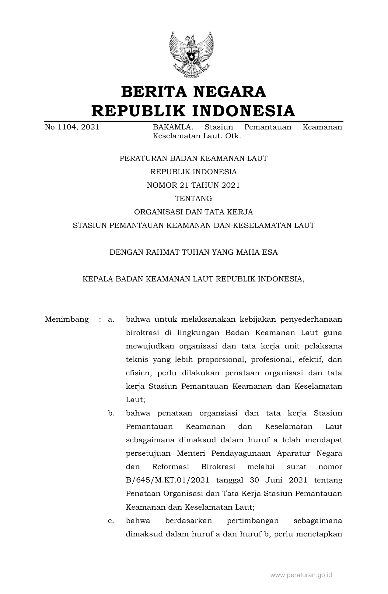 PERBAN Nomor 21 Tahun 2021 | Peraturan Badan Nomor 21 Tahun 2021 tentang ORGANISASI DAN TATA KERJA STASIUN PEMANTAUAN KEAMANAN DAN KESELAMATAN LAUT