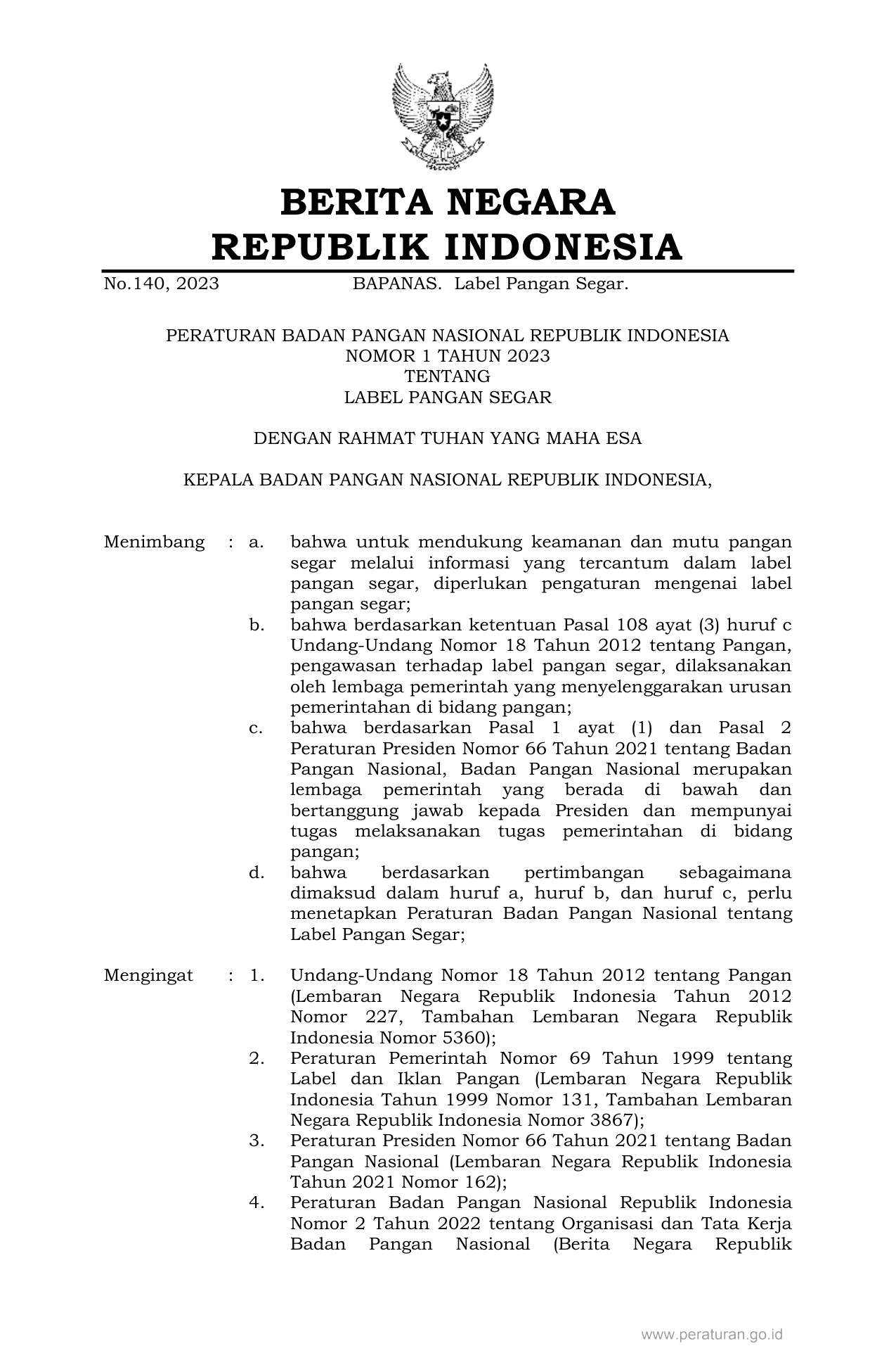 PERBAN Nomor 1 Tahun 2023 | Peraturan Badan Nomor 1 Tahun 2023 tentang LABEL PANGAN SEGAR