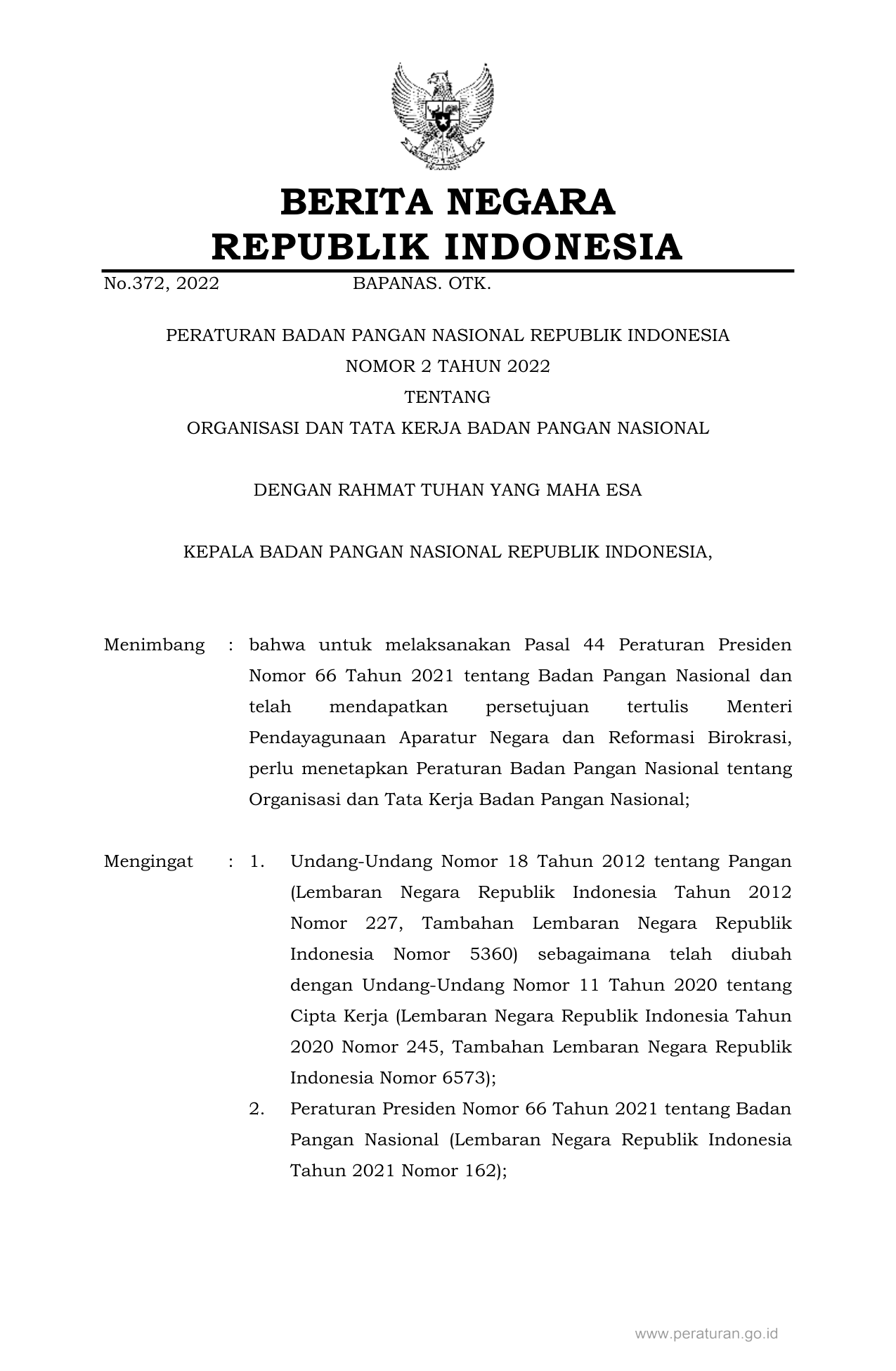 PERBAN Nomor 2 Tahun 2022 | Peraturan Badan Nomor 2 Tahun 2022 tentang ORGANISASI DAN TATA KERJA BADAN PANGAN NASIONAL