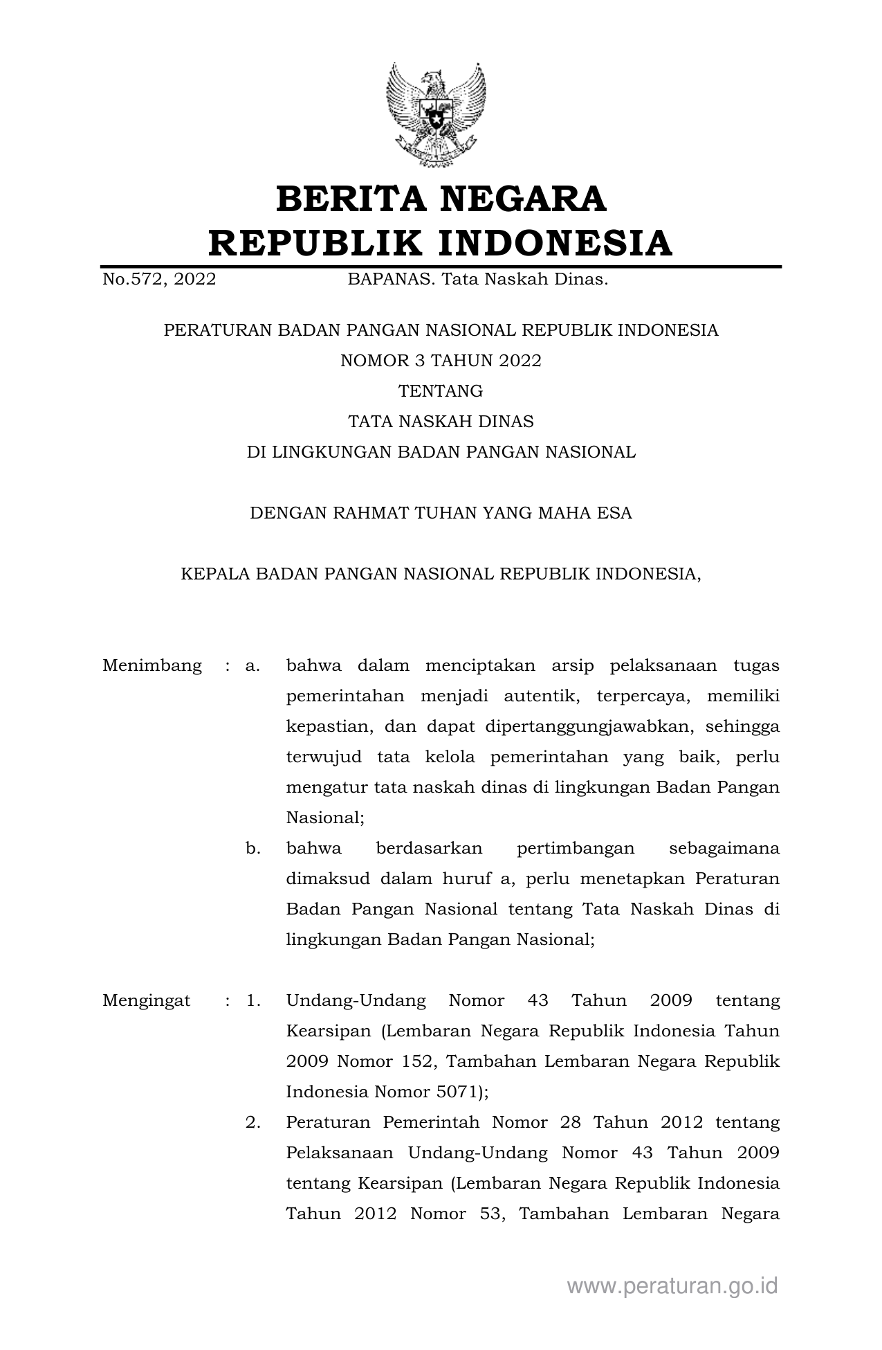 PERBAN Nomor 3 Tahun 2022 | Peraturan Badan Nomor 3 Tahun 2022 tentang TATA NASKAH DINAS DI LINGKUNGAN BADAN PANGAN NASIONAL