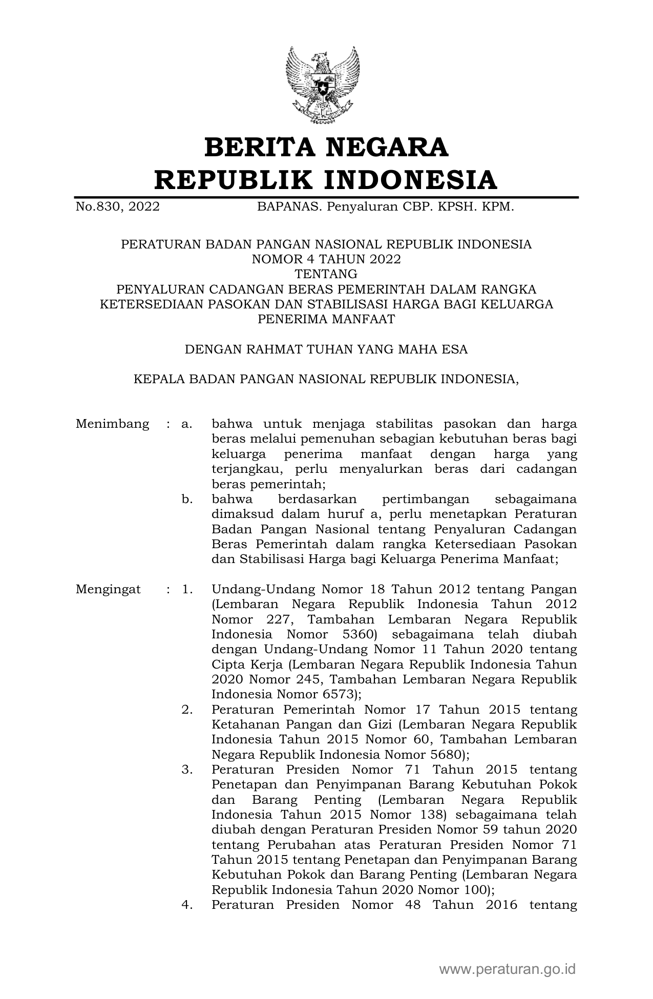 PERBAN Nomor 4 Tahun 2022 | Peraturan Badan Nomor 4 Tahun 2022 tentang PENYALURAN CADANGAN BERAS PEMERINTAH DALAM RANGKA KETERSEDIAAN PASOKAN DAN STABILISASI HARGA BAGI KELUARGA PENERIMA MANFAAT