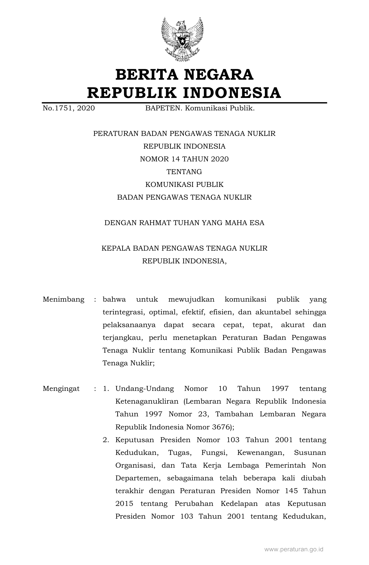 PERBAN Nomor 14 Tahun 2020 | Peraturan Badan Nomor 14 Tahun 2020 tentang KOMUNIKASI PUBLIK BADAN PENGAWAS TENAGA NUKLIR
