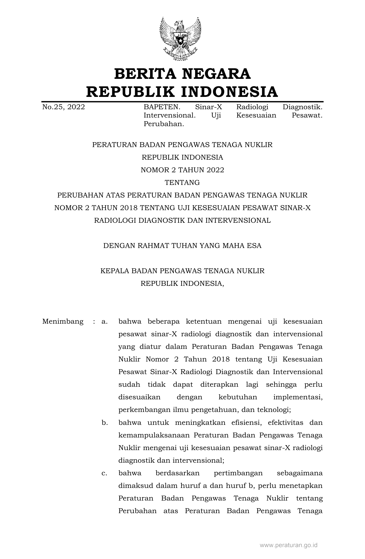 PERBAN Nomor 2 Tahun 2022 | Peraturan Badan Nomor 2 Tahun 2022 tentang PERUBAHAN ATAS PERATURAN BADAN PENGAWAS TENAGA NUKLIR NOMOR 2 TAHUN 2018 TENTANG UJI KESESUAIAN PESAWAT SINAR-X RADIOLOGI DIAGNOSTIK DAN INTERVENSIONAL