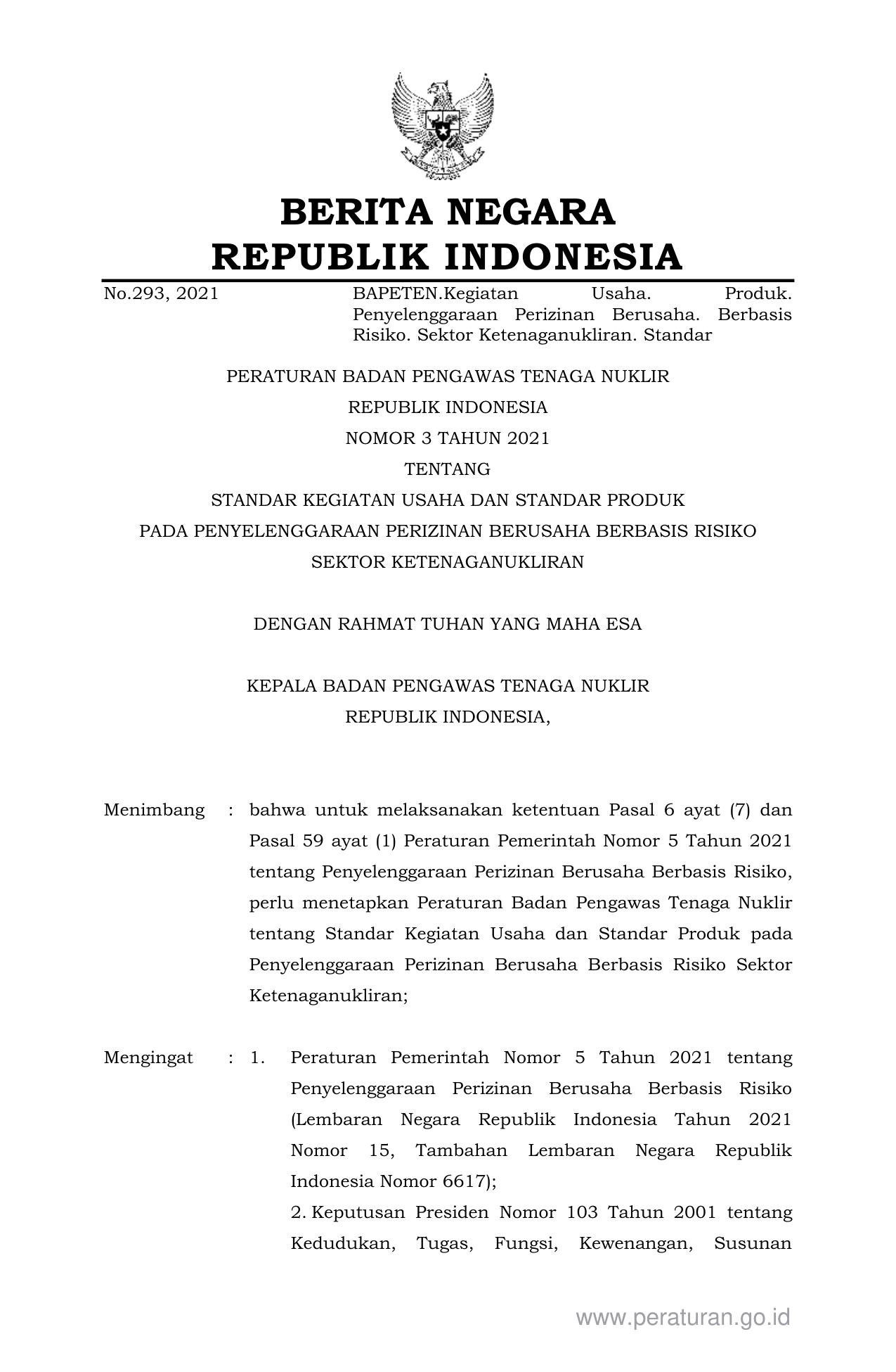 PERBAN Nomor 3 Tahun 2021 | Peraturan Badan Nomor 3 Tahun 2021 tentang STANDAR KEGIATAN USAHA DAN STANDAR PRODUK PADA PENYELENGGARAAN PERIZINAN BERUSAHA BERBASIS RISIKOSEKTOR KETENAGANUKLIRAN