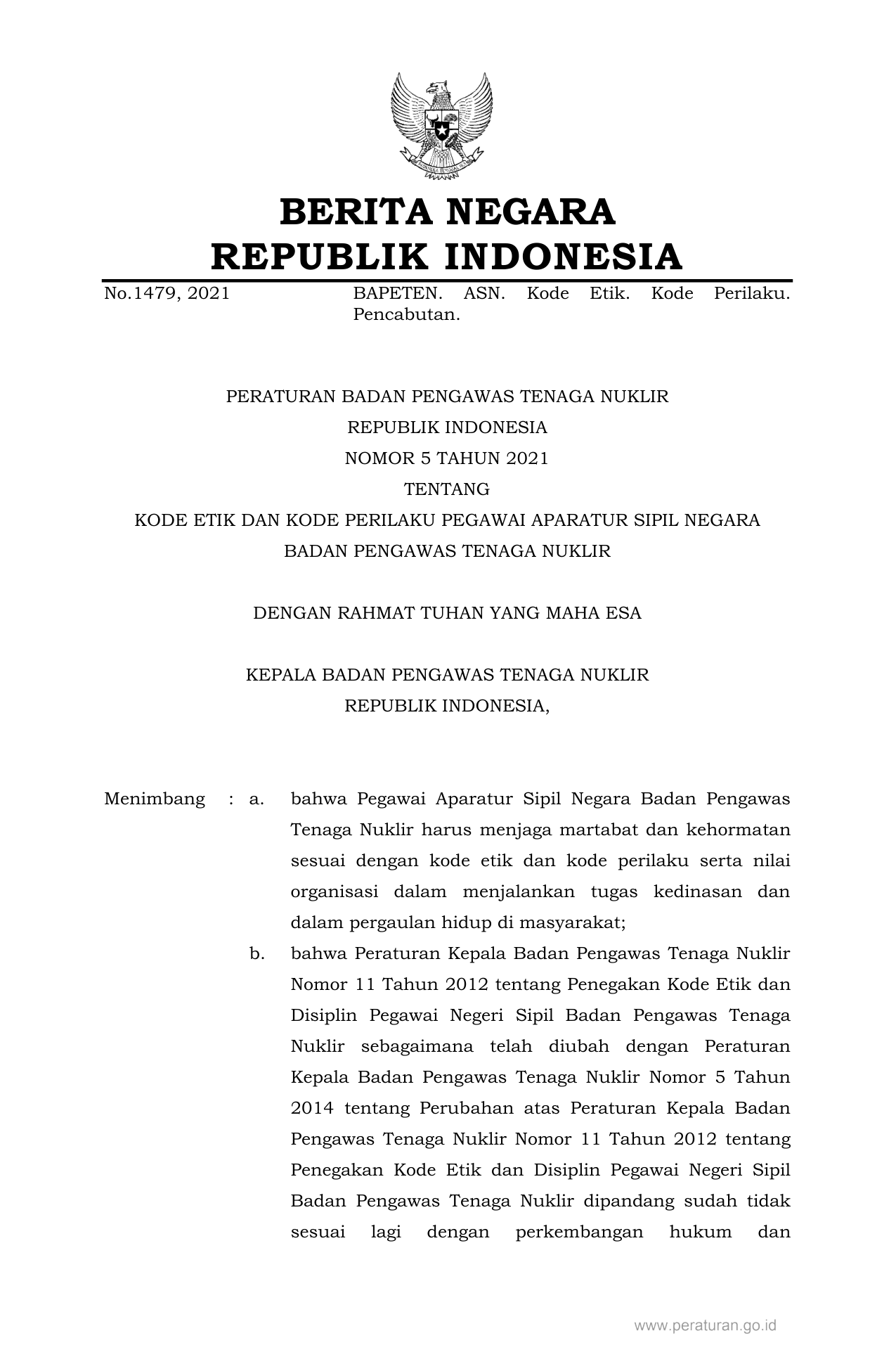 PERBAN Nomor 5 Tahun 2021 | Peraturan Badan Nomor 5 Tahun 2021 tentang KODE ETIK DAN KODE PERILAKU PEGAWAI APARATUR SIPIL NEGARA BADAN PENGAWAS TENAGA NUKLIR