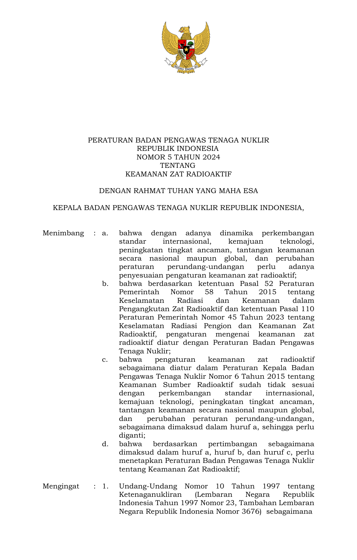 PERBAN Nomor 5 Tahun 2024 | Peraturan Badan Nomor 5 Tahun 2024 tentang KEAMANAN ZAT RADIOAKTIF