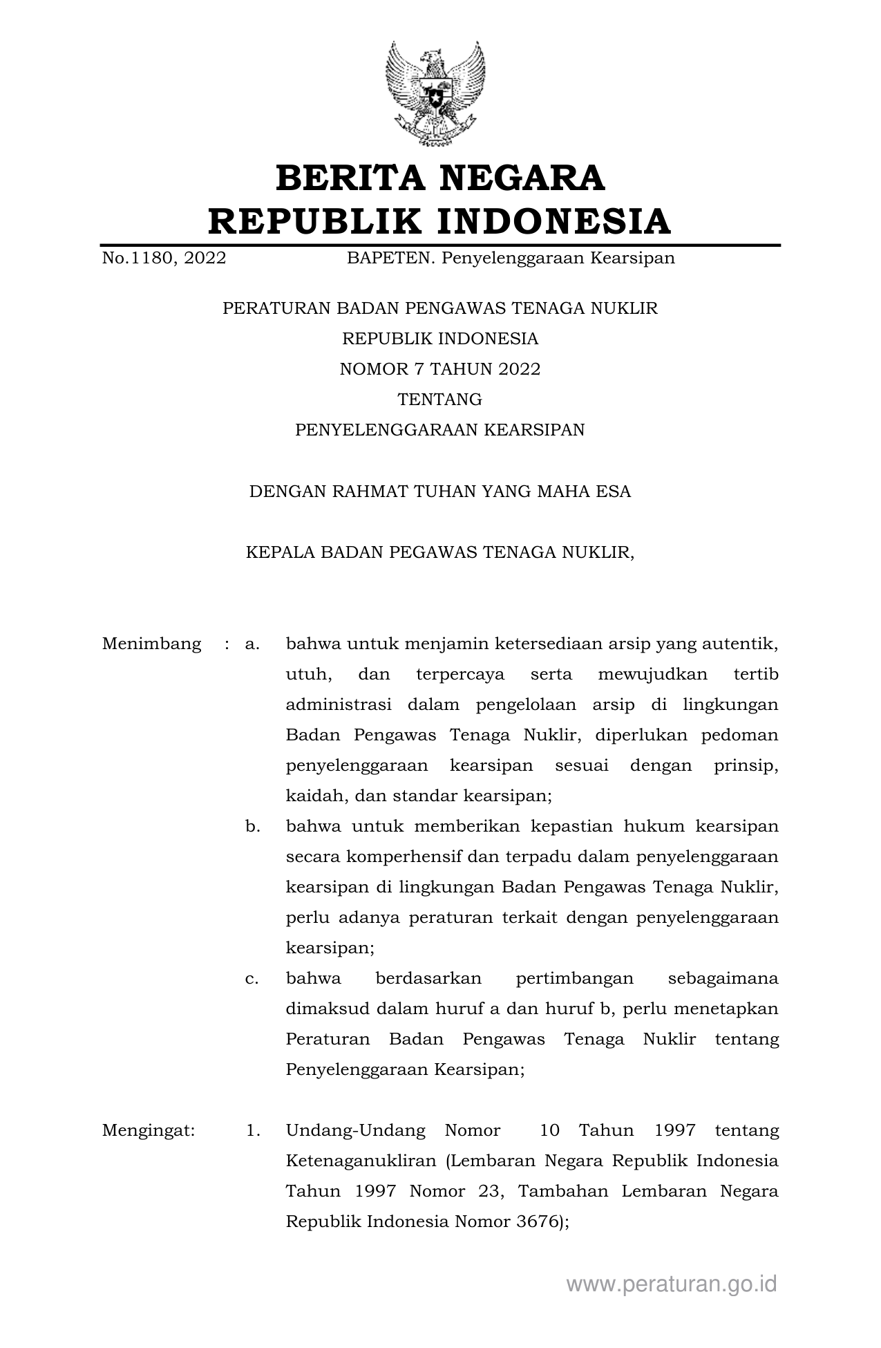 PERBAN Nomor 7 Tahun 2022 | Peraturan Badan Nomor 7 Tahun 2022 tentang PENYELENGGARAAN KEARSIPAN