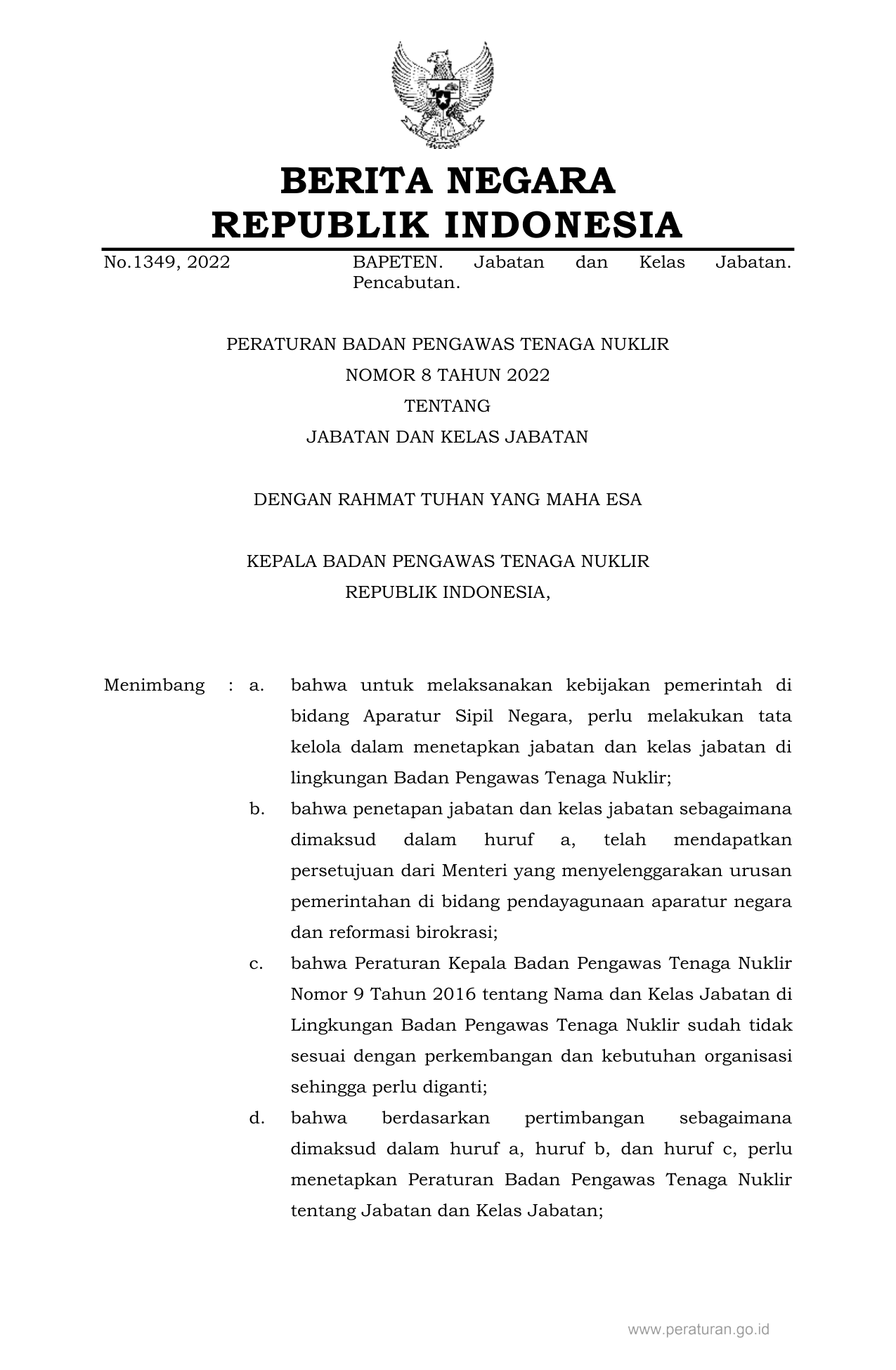 PERBAN Nomor 8 Tahun 2022 | Peraturan Badan Nomor 8 Tahun 2022 tentang JABATAN DAN KELAS JABATAN