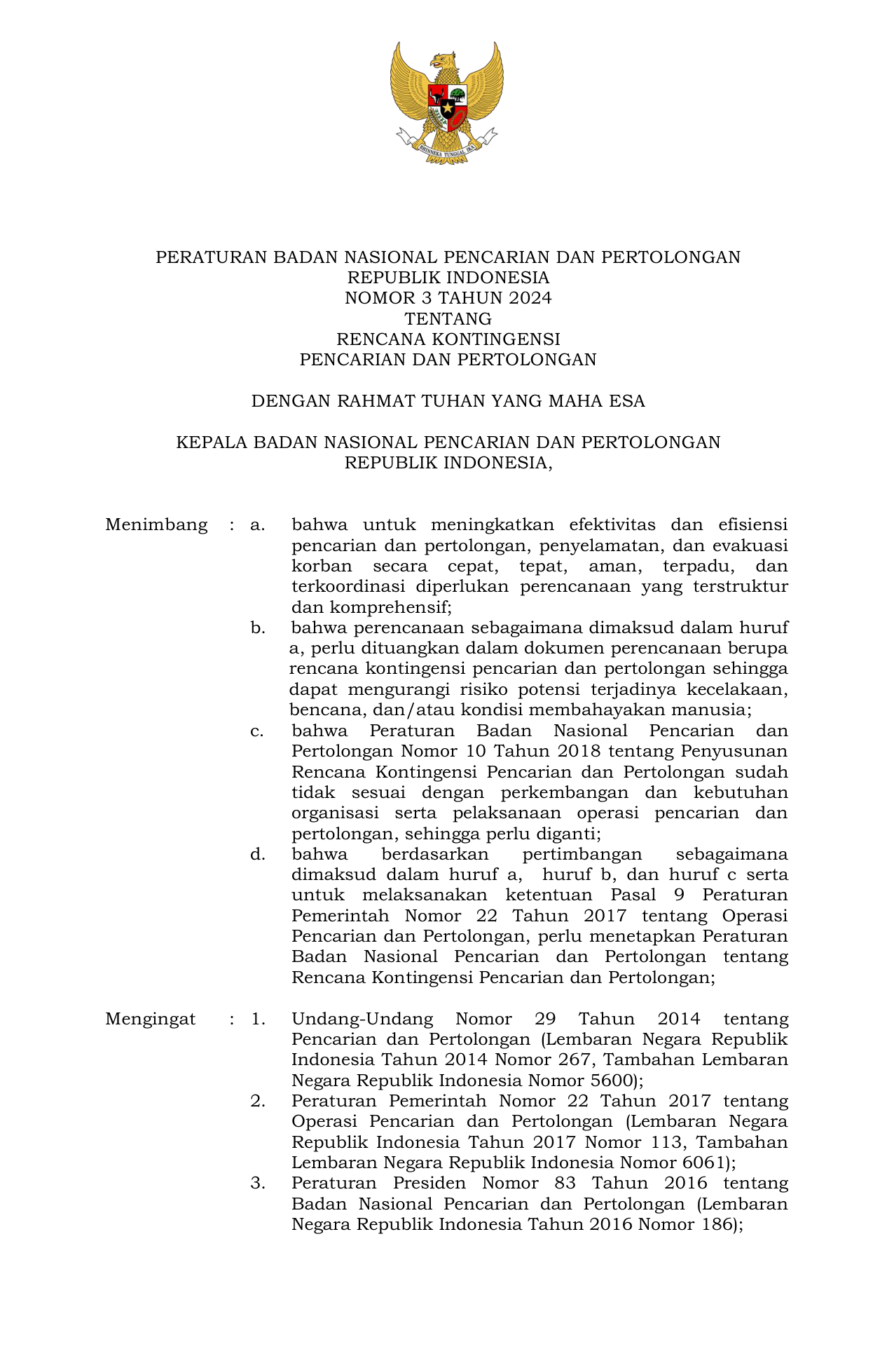 PERBAN Nomor 3 Tahun 2024 | Peraturan Badan Nomor 3 Tahun 2024 tentang Rencana Kontingensi Pencarian dan Pertolongan