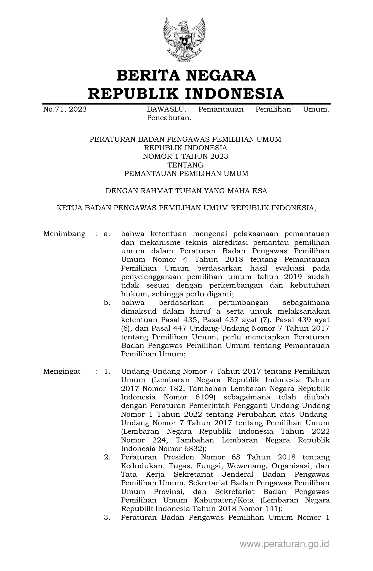 PERBAN Nomor 1 Tahun 2023 | Peraturan Badan Nomor 1 Tahun 2023 tentang PEMANTAUAN PEMILIHAN UMUM