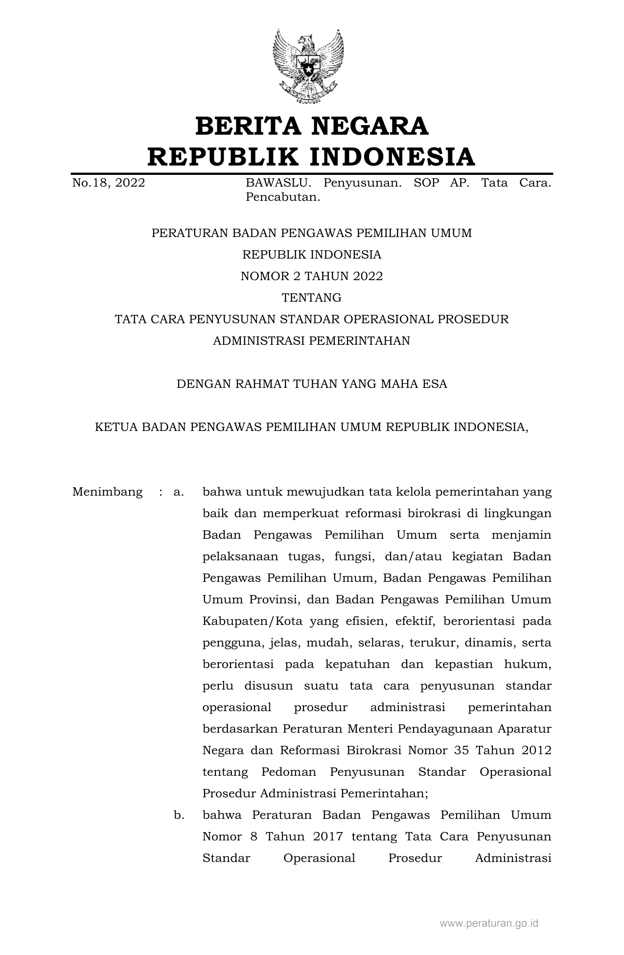 PERBAN Nomor 2 Tahun 2022 | Peraturan Badan Nomor 2 Tahun 2022 tentang TATA CARA PENYUSUNAN STANDAR OPERASIONAL PROSEDUR ADMINISTRASI PEMERINTAHAN