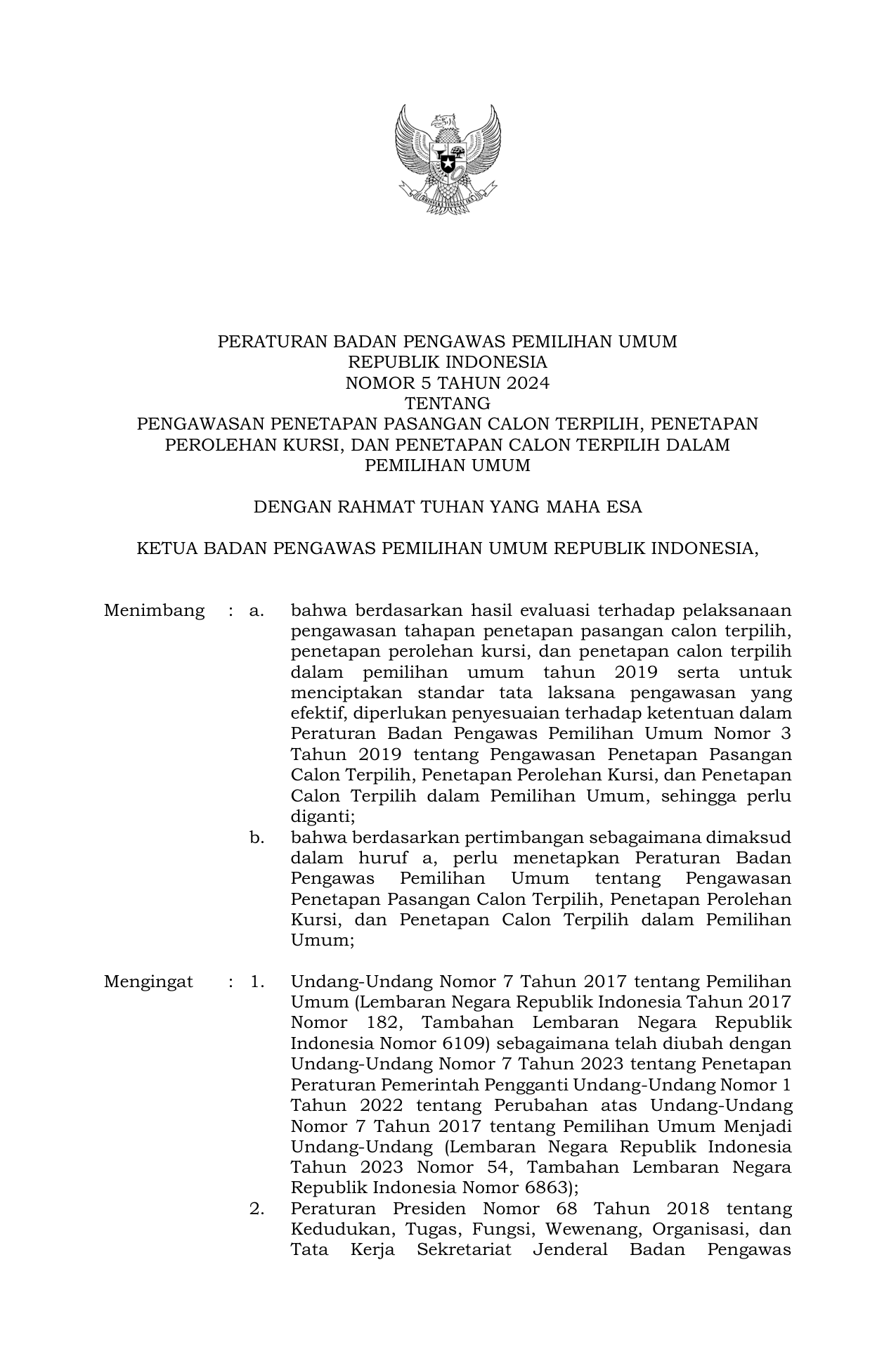 PERBAN Nomor 5 Tahun 2024 | Peraturan Badan Nomor 5 Tahun 2024 tentang Pengawasan Penetapan Pasangan Calon Terpilih, Penetapan Perolehan Kursi, dan Penetapan Calon Terpilih dalam Pemilihan Umum