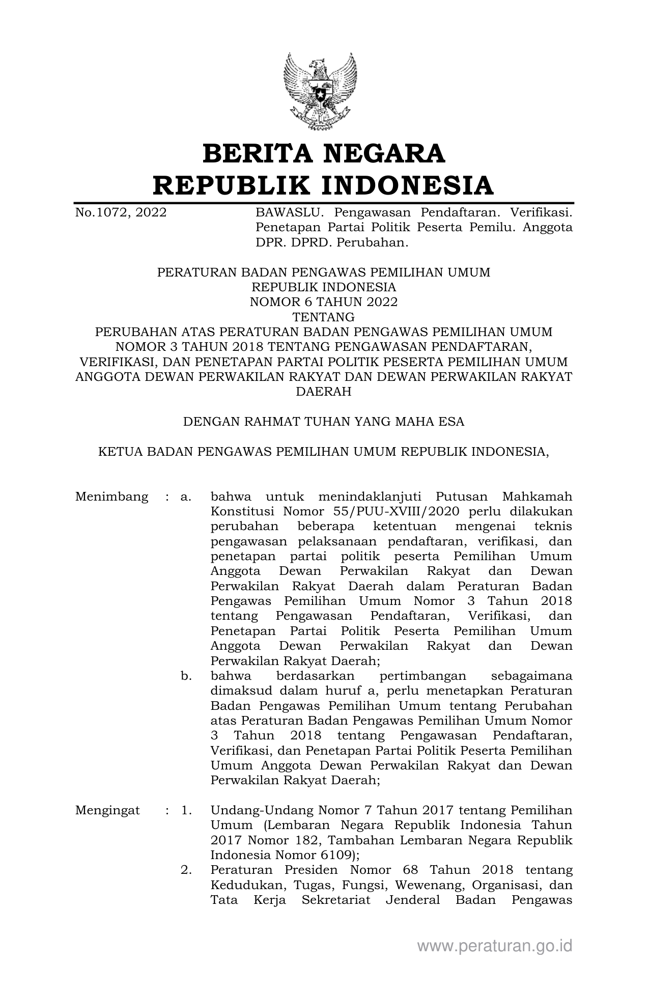 PERBAN Nomor 6 Tahun 2022 | Peraturan Badan Nomor 6 Tahun 2022 tentang PERUBAHAN ATAS PERATURAN BADAN PENGAWAS PEMILIHAN UMUM NOMOR 3 TAHUN 2018 TENTANG PENGAWASAN PENDAFTARAN, VERIFIKASI, DAN PENETAPAN PARTAI POLITIK PESERTA PEMILIHAN UMUMANGGOTA DEWAN PERWAKILAN RAKYAT DAN DEWAN PERWAKILAN RAKYAT DAERAH