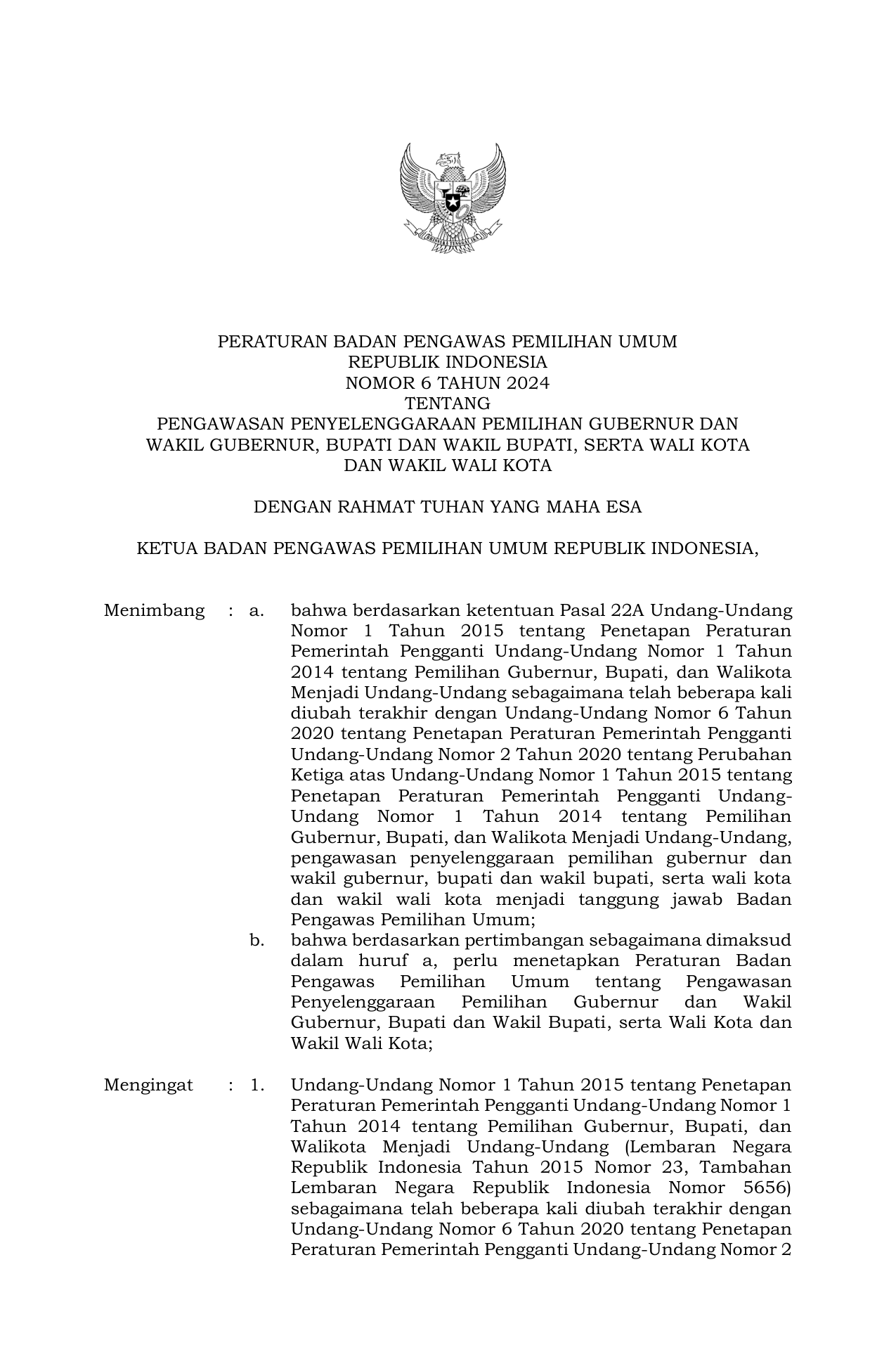 PERBAN Nomor 6 Tahun 2024 | Peraturan Badan Nomor 6 Tahun 2024 tentang PENGAWASAN PENYELENGGARAAN PEMILIHAN GUBERNUR DAN WAKIL GUBERNUR, BUPATI DAN WAKIL BUPATI, SERTA WALI KOTA DAN WAKIL WALI KOTA
