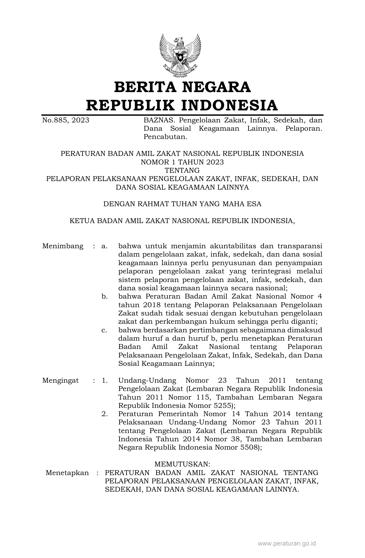PERBAN Nomor 1 Tahun 2023 | Peraturan Badan Nomor 1 Tahun 2023 tentang PELAPORAN PELAKSANAAN PENGELOLAAN ZAKAT, INFAK, SEDEKAH, DAN DANA SOSIAL KEAGAMAAN LAINNYA