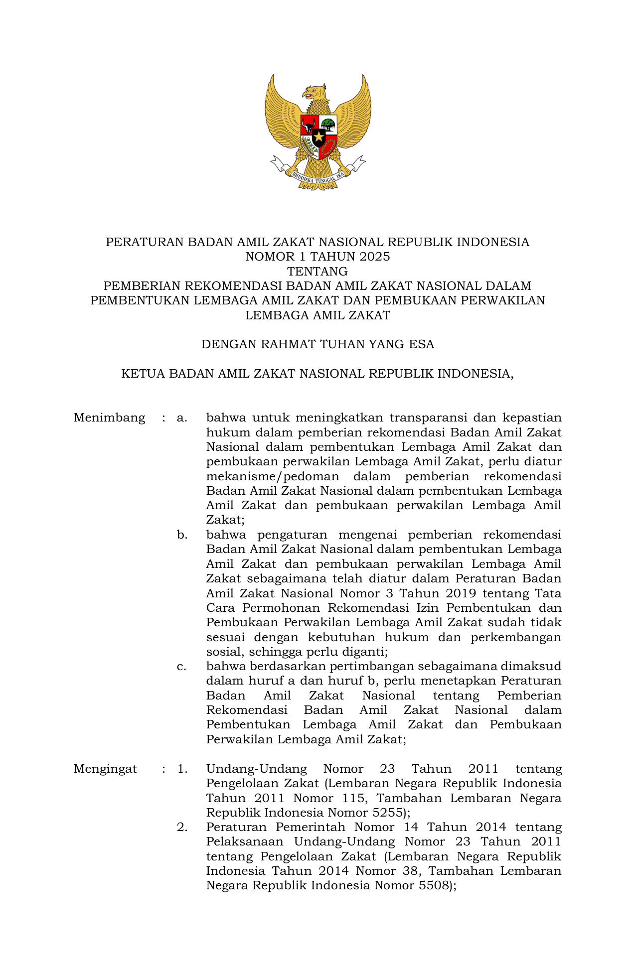 PERBAN Nomor 1 Tahun 2025 | Peraturan Badan Nomor 1 Tahun 2025 tentang PEMBERIAN REKOMENDASI BADAN AMIL ZAKAT NASIONAL DALAM PEMBENTUKAN LEMBAGA AMIL ZAKAT DAN PEMBUKAAN PERWAKILANLEMBAGA AMIL ZAKAT