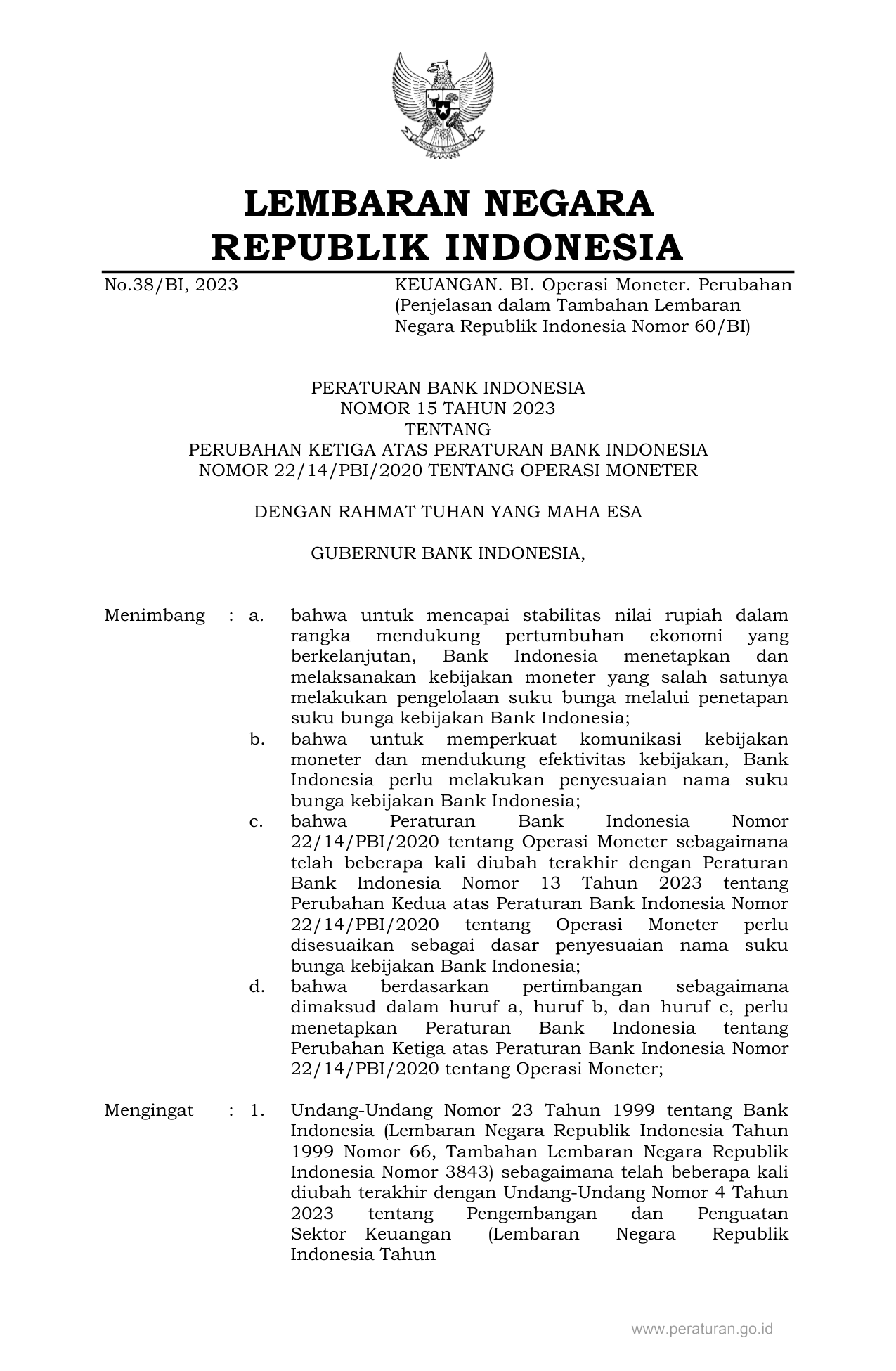 PERBAN Nomor 15 Tahun 2023 | Peraturan Badan Nomor 15 Tahun 2023 tentang PERUBAHAN KETIGA ATAS PERATURAN BANK INDONESIA NOMOR 22/14/PBI/2020 TENTANG OPERASI MONETER