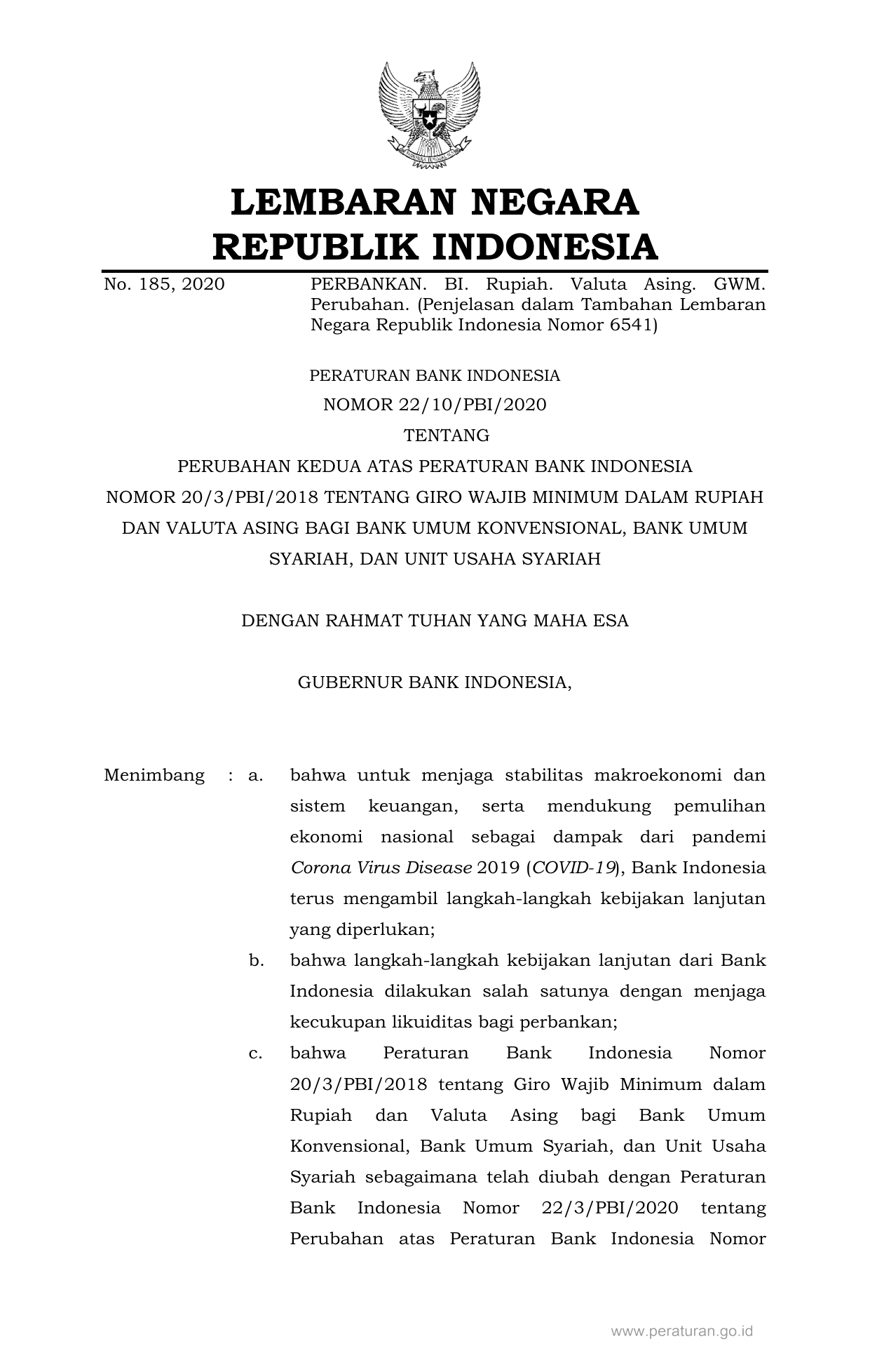 PERBAN Nomor 22-10-pbi-2020 Tahun 2020 | Peraturan Badan Nomor 22-10-pbi-2020 Tahun 2020 tentang PERUBAHAN KEDUA ATAS PERATURAN BANK INDONESIA NOMOR 20/3/PBI/2018 TENTANG GIRO WAJIB MINIMUM DALAM RUPIAH DAN VALUTA ASING BAGI BANK UMUM KONVENSIONAL, BANK UMUM SYARIAH, DAN UNIT USAHA SYARIAH