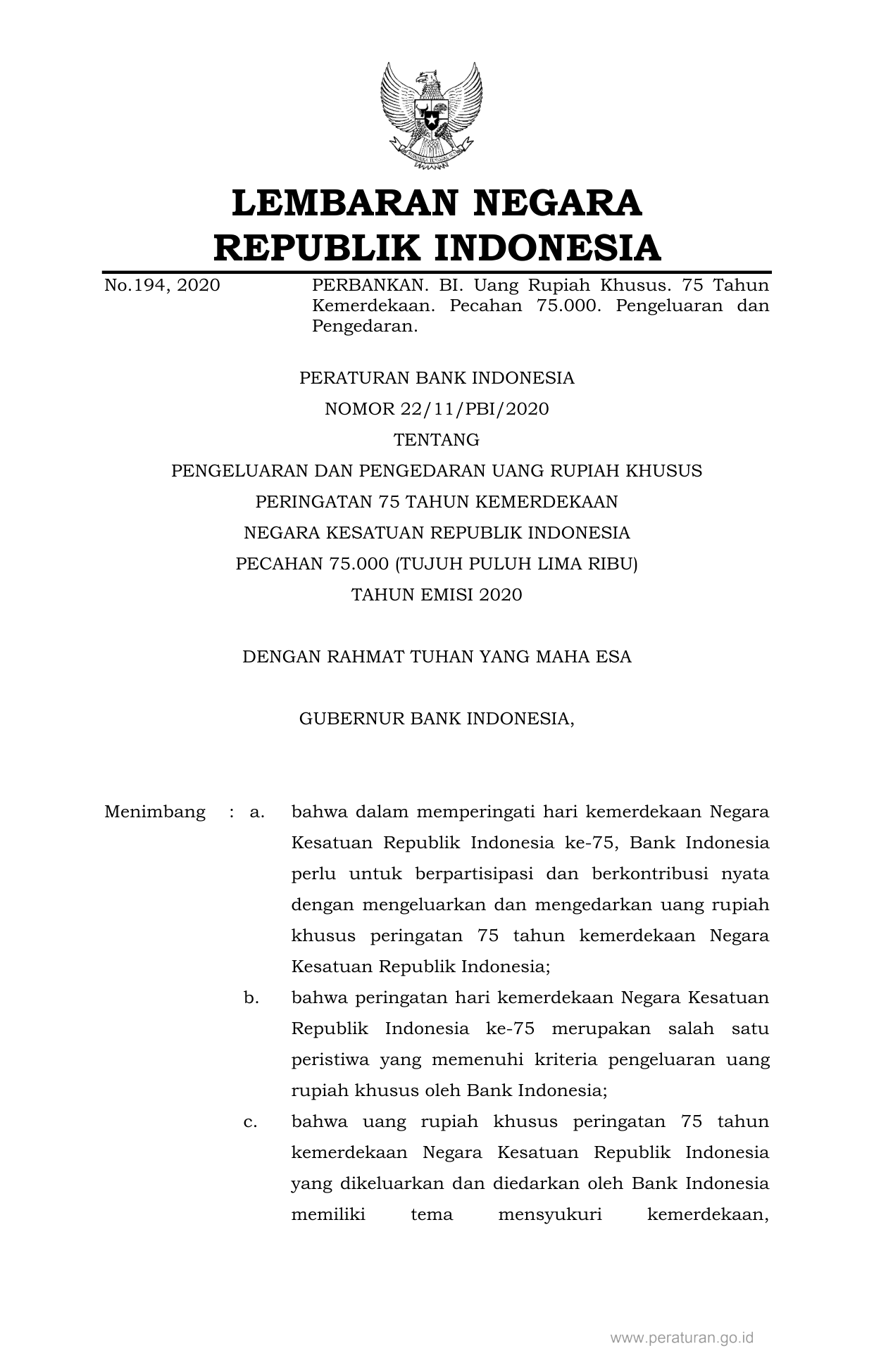 PERBAN Nomor 22-11-pbi-2020 Tahun 2020 | Peraturan Badan Nomor 22-11-pbi-2020 Tahun 2020 tentang PENGELUARAN DAN PENGEDARAN UANG RUPIAH KHUSUS PERINGATAN 75 TAHUN KEMERDEKAAN NEGARA KESATUAN REPUBLIK INDONESIA PECAHAN 75.000 (TUJUH PULUH LIMA RIBU) TAHUN EMISI 2020