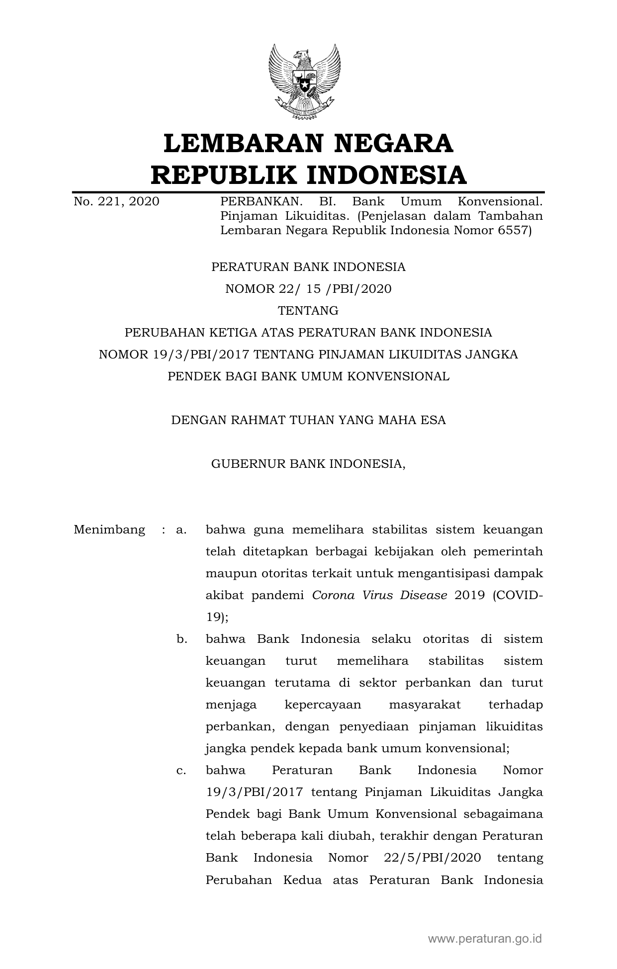 PERBAN Nomor 22-15-pbi-2020 Tahun 2020 | Peraturan Badan Nomor 22-15-pbi-2020 Tahun 2020 tentang PERUBAHAN KETIGA ATAS PERATURAN BANK INDONESIA NOMOR 19/3/PBI/2017 TENTANG PINJAMAN LIKUIDITAS JANGKA PENDEK BAGI BANK UMUM KONVENSIONAL