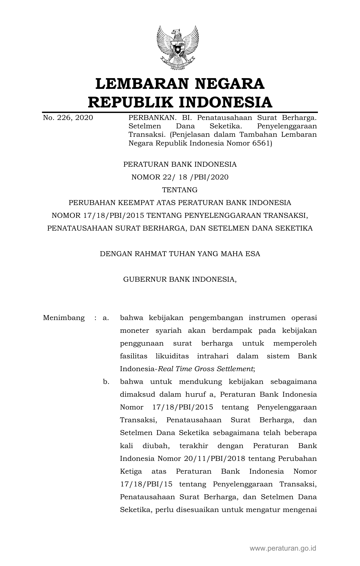 PERBAN Nomor 22-18-pbi-2020 Tahun 2020 | Peraturan Badan Nomor 22-18-pbi-2020 Tahun 2020 tentang PERUBAHAN KEEMPAT ATAS PERATURAN BANK INDONESIA NOMOR 17/18/PBI/2015 TENTANG PENYELENGGARAAN TRANSAKSI, PENATAUSAHAAN SURAT BERHARGA, DAN SETELMEN DANA SEKETIKA