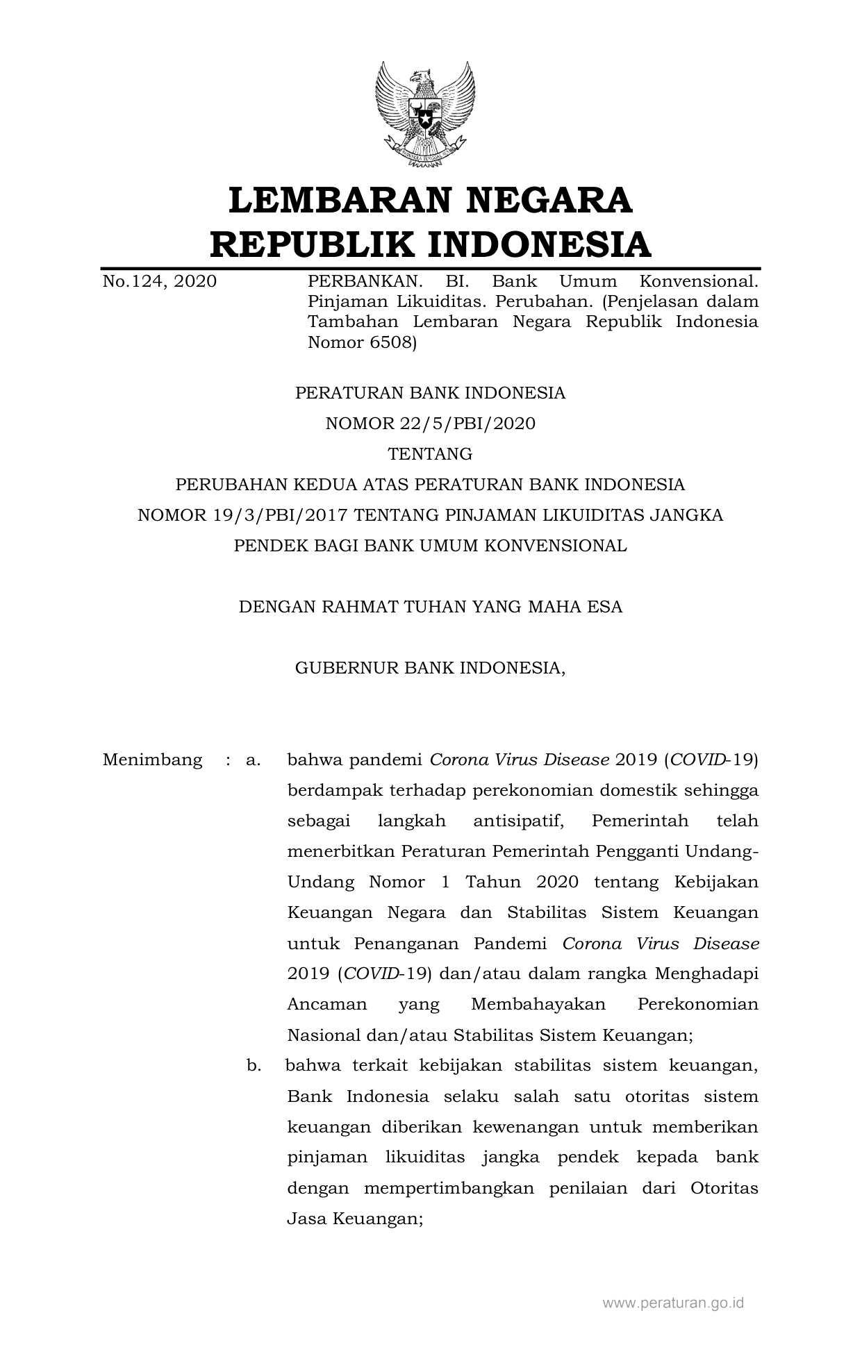PERBAN Nomor 22-5-pbi-2020 Tahun 2020 | Peraturan Badan Nomor 22-5-pbi-2020 Tahun 2020 tentang PERUBAHAN KEDUA ATAS PERATURAN BANK INDONESIA NOMOR 19/3/PBI/2017 TENTANG PINJAMAN LIKUIDITAS JANGKA PENDEK BAGI BANK UMUM KONVENSIONAL