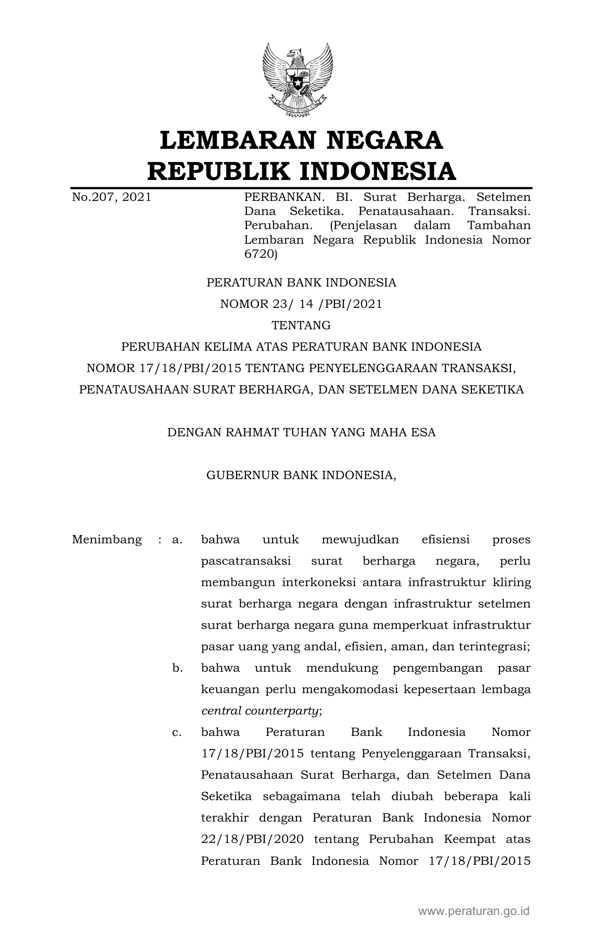 PERBAN Nomor 23-14-pbi-2021 Tahun 2021 | Peraturan Badan Nomor 23-14-pbi-2021 Tahun 2021 tentang PERUBAHAN KELIMA ATAS PERATURAN BANK INDONESIA NOMOR 17/18/PBI/2015 TENTANG PENYELENGGARAAN TRANSAKSI, PENATAUSAHAAN SURAT BERHARGA, DAN SETELMEN DANA SEKETIKA