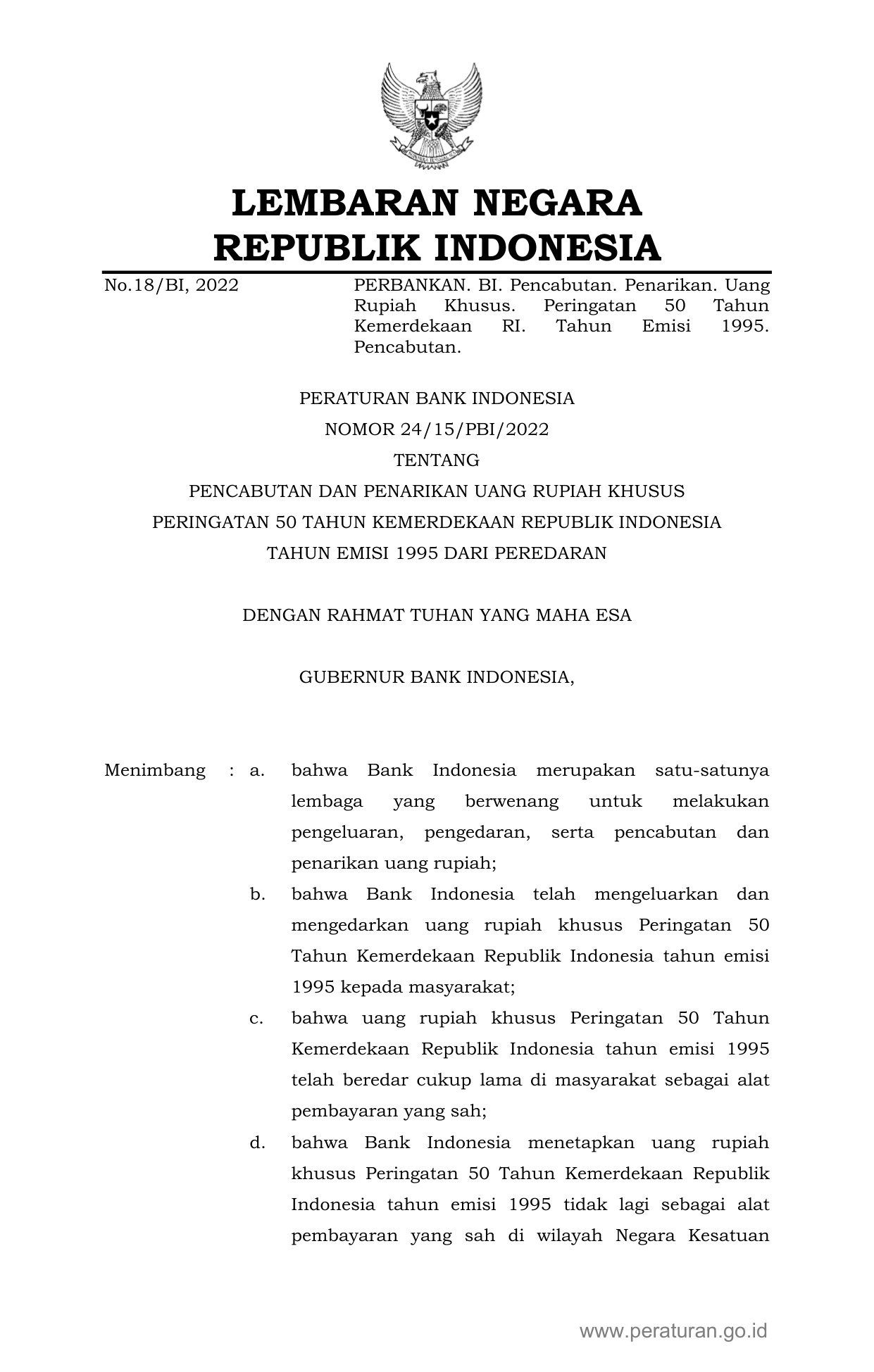 PERBAN Nomor 24-15-pbi-2022 Tahun 2022 | Peraturan Badan Nomor 24-15-pbi-2022 Tahun 2022 tentang PENCABUTAN DAN PENARIKAN UANG RUPIAH KHUSUS PERINGATAN 50 TAHUN KEMERDEKAAN REPUBLIK INDONESIA TAHUN EMISI 1995 DARI PEREDARAN