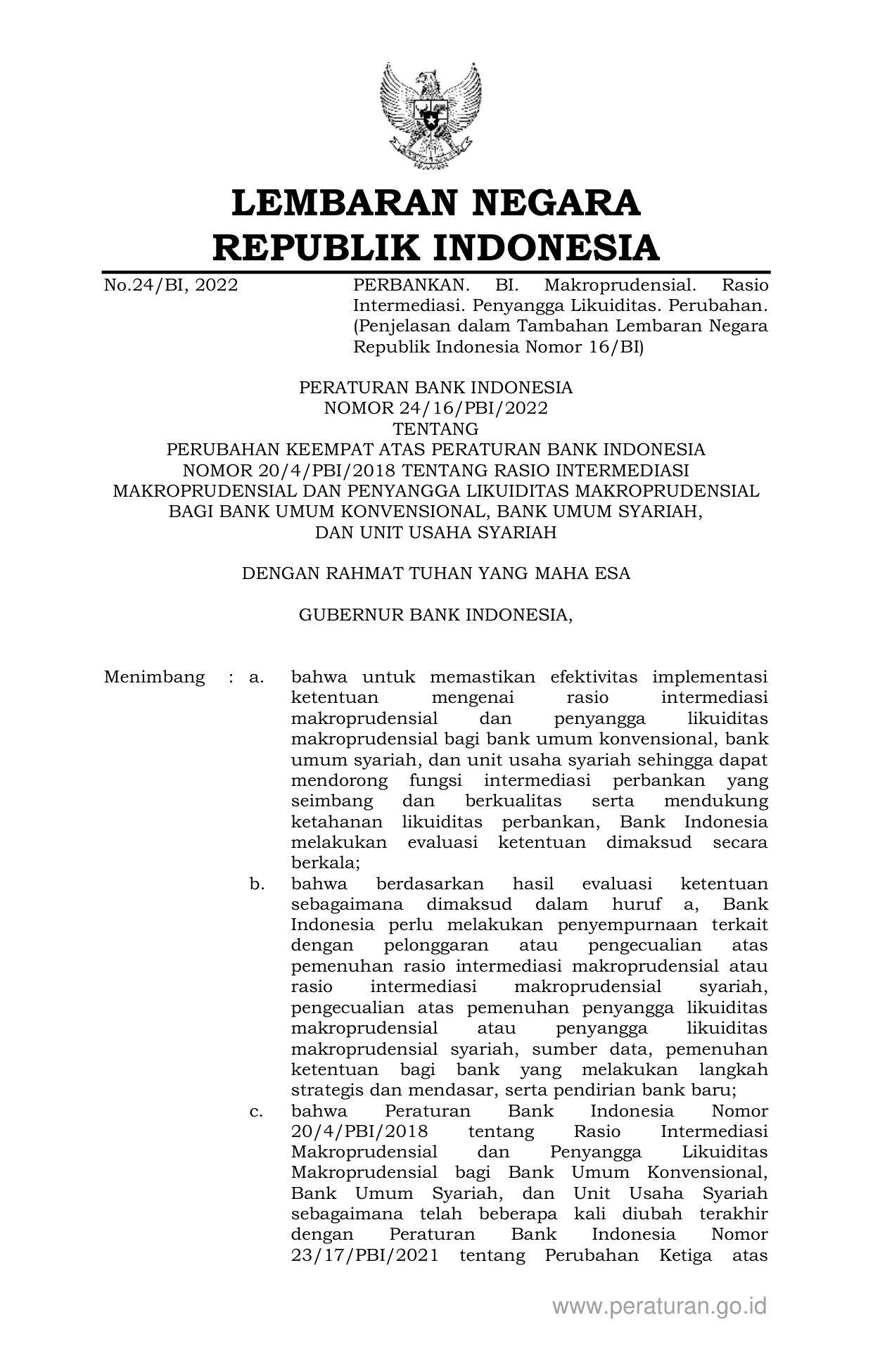 PERBAN Nomor 24-16-pbi-2022 Tahun 2022 | Peraturan Badan Nomor 24-16-pbi-2022 Tahun 2022 tentang PERUBAHAN KEEMPAT ATAS PERATURAN BANK INDONESIA NOMOR 20/4/PBI/2018 TENTANG RASIO INTERMEDIASI MAKROPRUDENSIAL DAN PENYANGGA LIKUIDITAS MAKROPRUDENSIAL BAGI BANK UMUM KONVENSIONAL, BANK UMUM SYARIAH, DAN UNIT USAHA SYARIAH