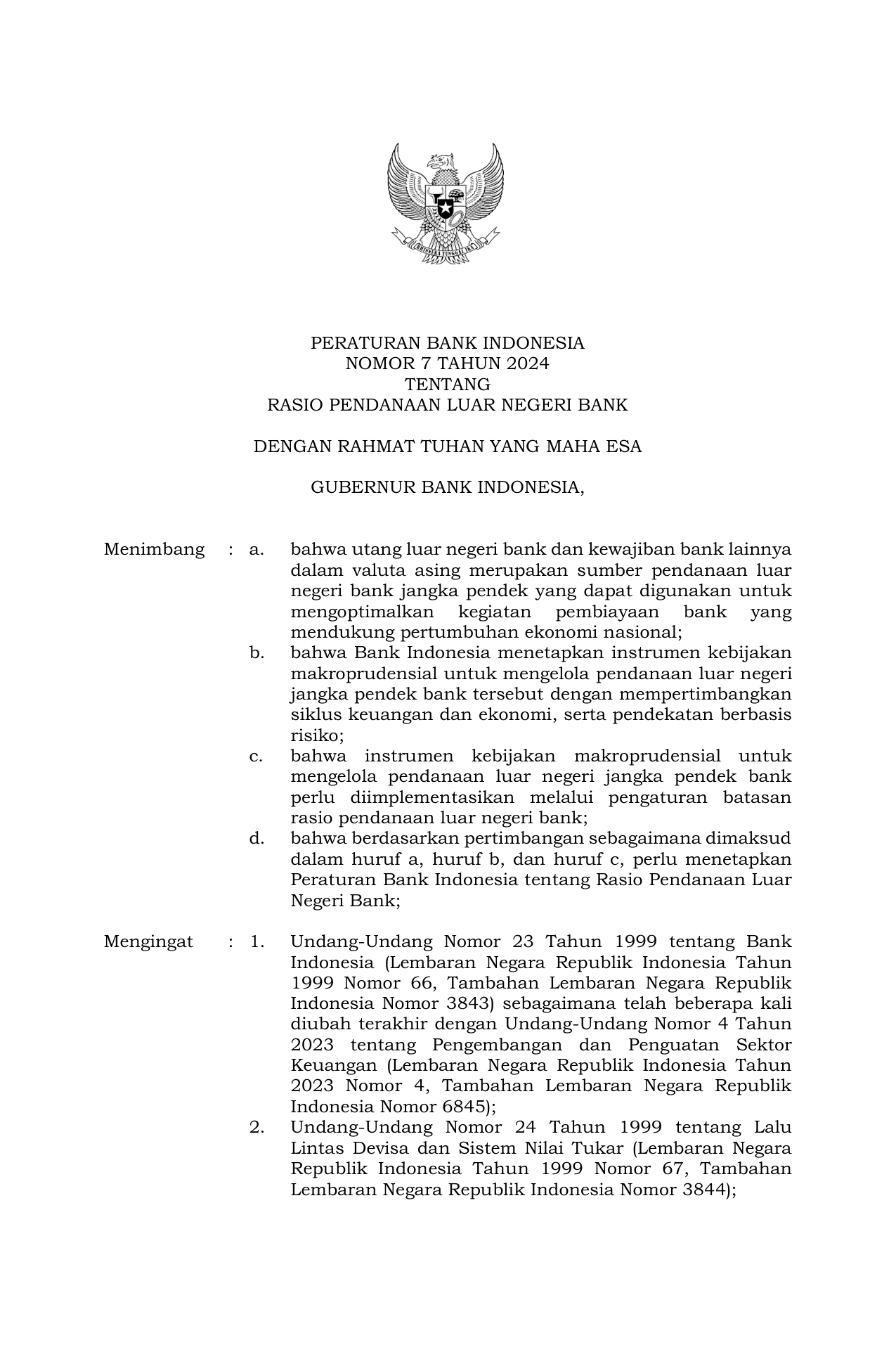 PERBAN Nomor 7 Tahun 2024 | Peraturan Badan Nomor 7 Tahun 2024 tentang Rasio Pendanaan Luar Negeri Bank
