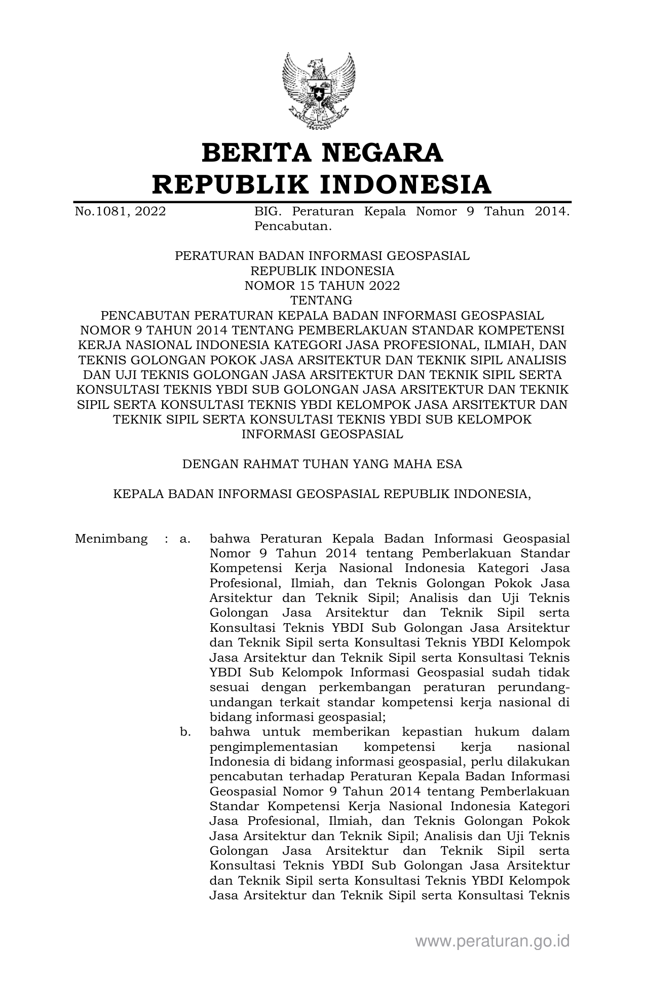 PERBAN Nomor 15 Tahun 2022 | Peraturan Badan Nomor 15 Tahun 2022 tentang PENCABUTAN PERATURAN KEPALA BADAN INFORMASI GEOSPASIAL NOMOR 9 TAHUN 2014 TENTANG PEMBERLAKUAN STANDAR KOMPETENSI KERJA NASIONAL INDONESIA KATEGORI JASA PROFESIONAL, ILMIAH, DAN TEKNIS GOLONGAN POKOK JASA ARSITEKTUR DAN TEKNIK SIPIL ANALISIS DAN UJI TEKNIS GOLONGAN JASA ARSITEKTUR DAN TEKNIK SIPIL SERTA KONSULTASI TEKNIS YBDI SUB GOLONGAN JASA ARSITEKTUR DAN TEKNIK SIPIL SERTA KONSULTASI TEKNIS YBDI KELOMPOK JASA ARSITEKTUR DAN TEKNIK SIPIL SERTA KONSULTASI TEKNIS YBDI SUB KELOMPOK INFORMASI GEOSPASIAL