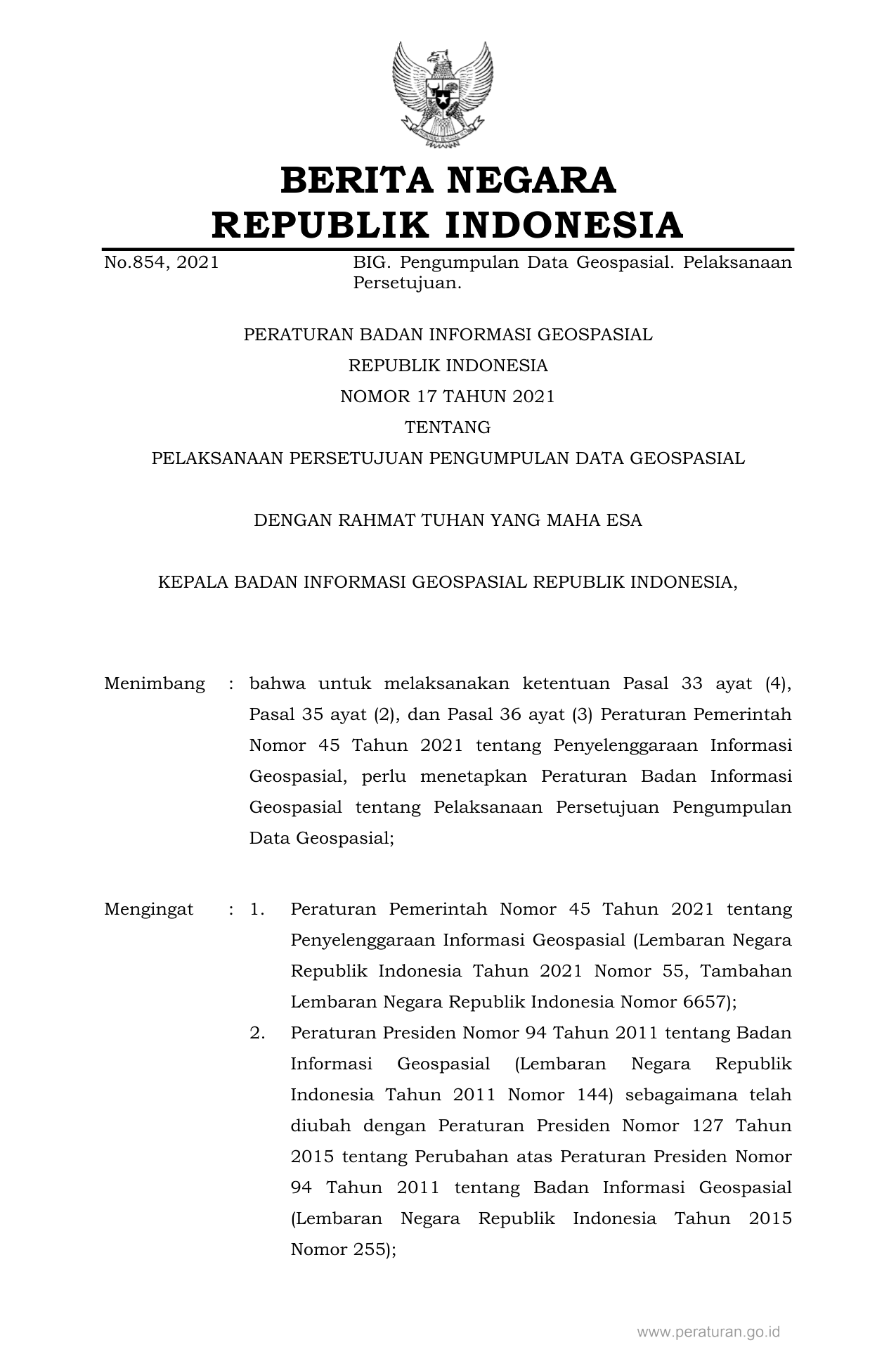 PERBAN Nomor 17 Tahun 2021 | Peraturan Badan Nomor 17 Tahun 2021 tentang PELAKSANAAN PERSETUJUAN PENGUMPULAN DATA GEOSPASIAL