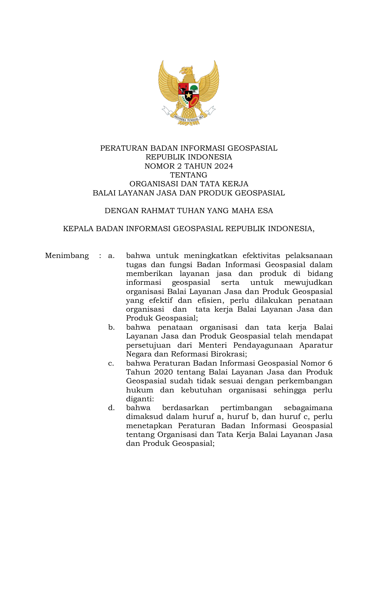PERBAN Nomor 2 Tahun 2024 | Peraturan Badan Nomor 2 Tahun 2024 tentang Organisasi dan Tata Kerja Balai Layanan Jasa dan Produk Geospasial