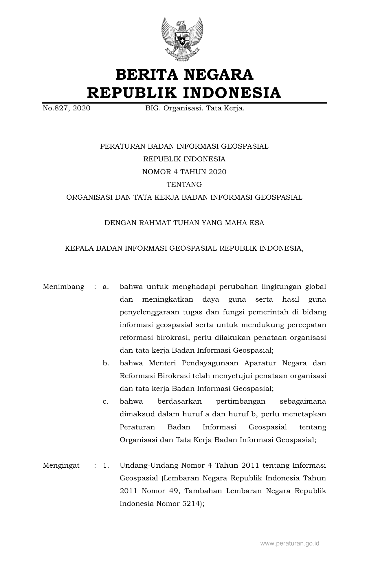PERBAN Nomor 4 Tahun 2020 | Peraturan Badan Nomor 4 Tahun 2020 tentang ORGANISASI DAN TATA KERJA BADAN INFORMASI GEOSPASIAL