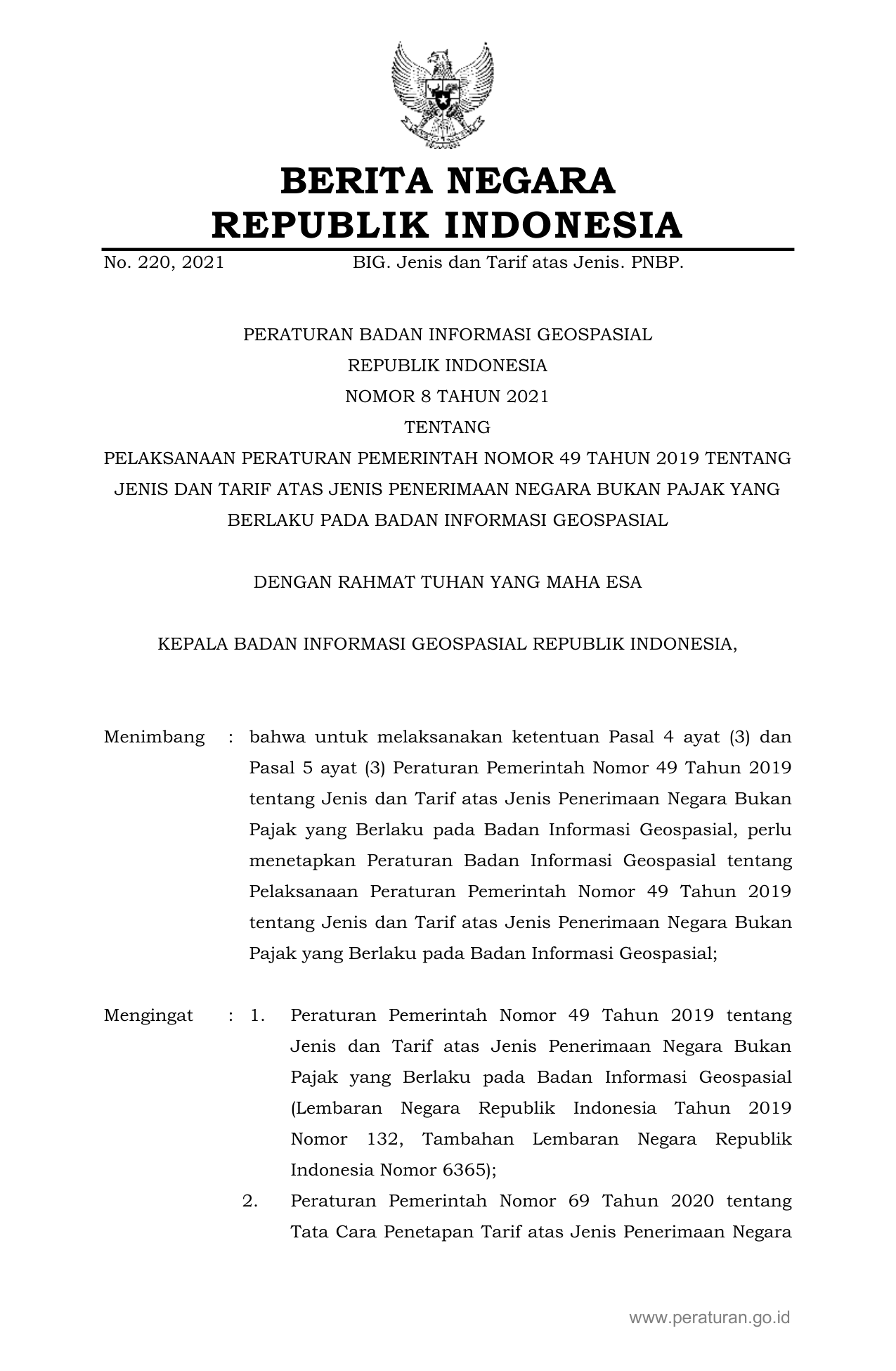 PERBAN Nomor 8 Tahun 2021 | Peraturan Badan Nomor 8 Tahun 2021 tentang PELAKSANAAN PERATURAN PEMERINTAH NOMOR 49 TAHUN 2019 TENTANG JENIS DAN TARIF ATAS JENIS PENERIMAAN NEGARA BUKAN PAJAK YANG BERLAKU PADA BADAN INFORMASI GEOSPASIAL