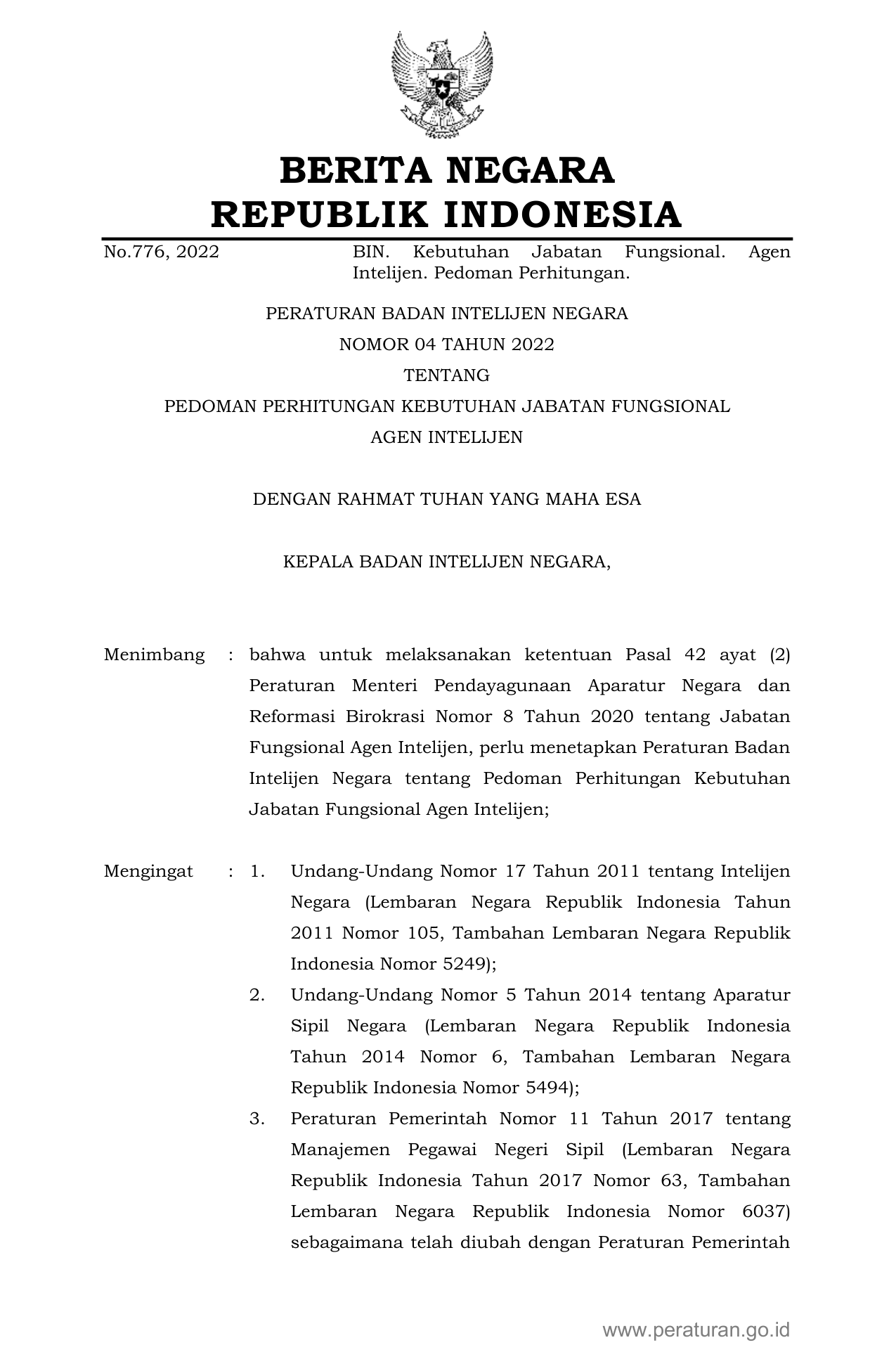 PERBAN Nomor 04 Tahun 2022 | Peraturan Badan Nomor 04 Tahun 2022 tentang PEDOMAN PERHITUNGAN KEBUTUHAN JABATAN FUNGSIONAL AGEN INTELIJEN