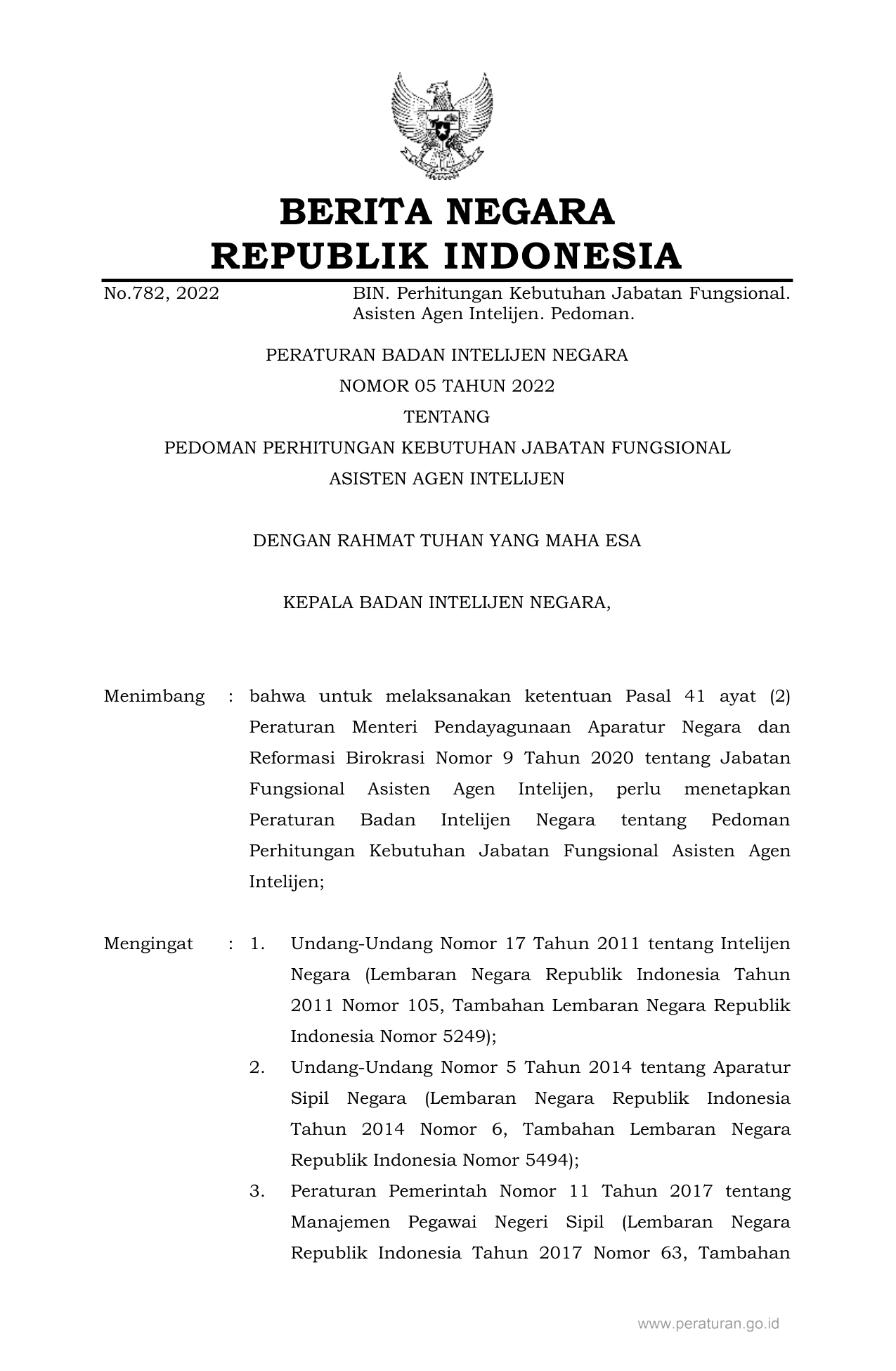 PERBAN Nomor 05 Tahun 2022 | Peraturan Badan Nomor 05 Tahun 2022 tentang PEDOMAN PERHITUNGAN KEBUTUHAN JABATAN FUNGSIONAL ASISTEN AGEN INTELIJEN