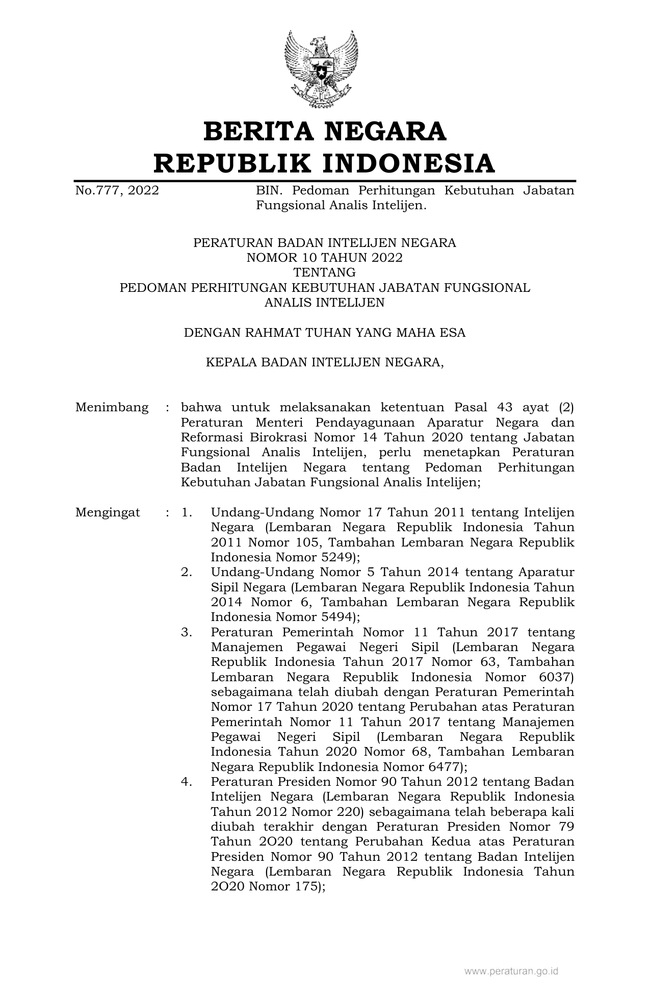 PERBAN Nomor 10 Tahun 2022 | Peraturan Badan Nomor 10 Tahun 2022 tentang PEDOMAN PERHITUNGAN KEBUTUHAN JABATAN FUNGSIONAL ANALIS INTELIJEN