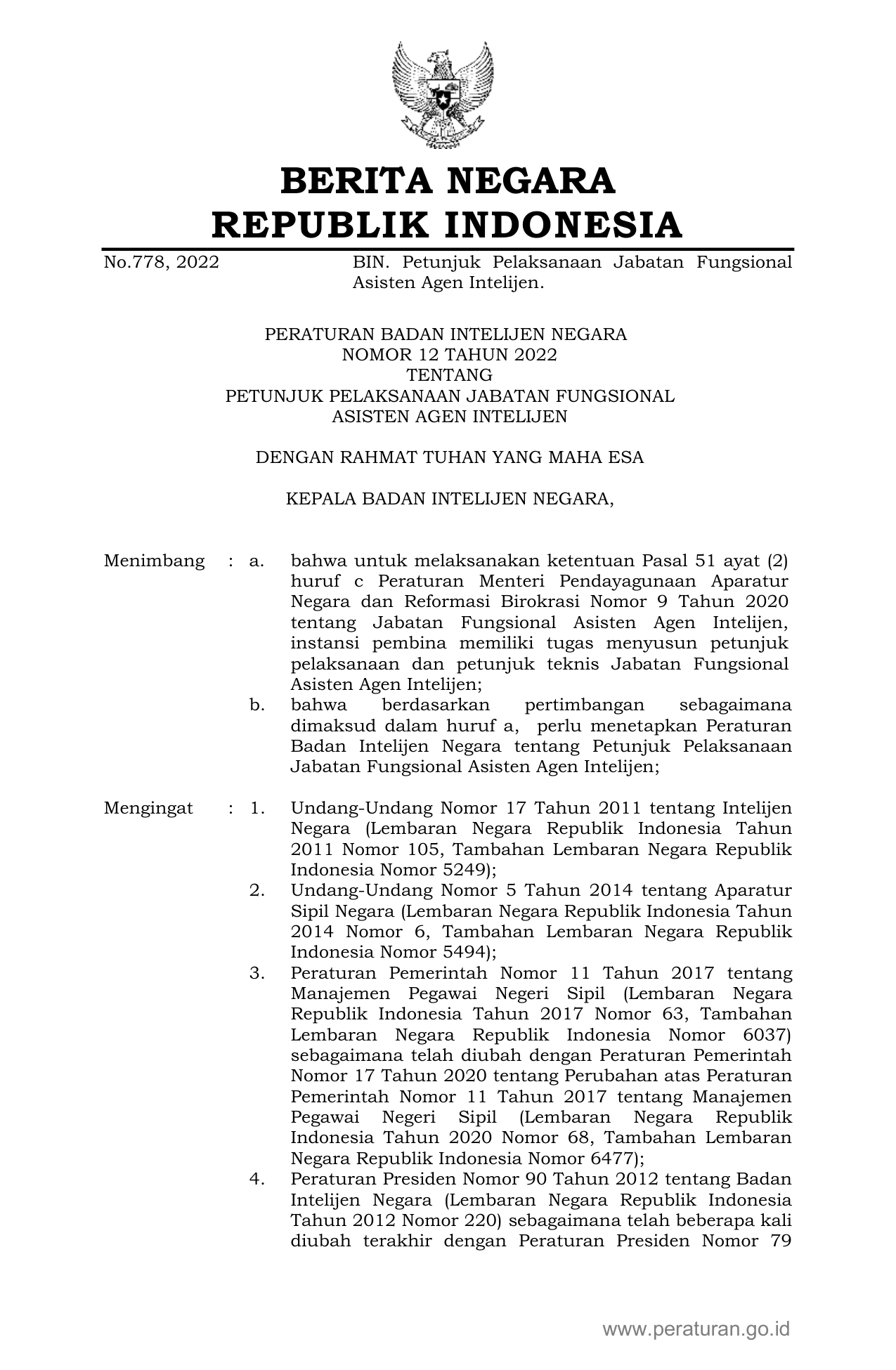 PERBAN Nomor 12 Tahun 2022 | Peraturan Badan Nomor 12 Tahun 2022 tentang PETUNJUK PELAKSANAAN JABATAN FUNGSIONAL ASISTEN AGEN INTELIJEN
