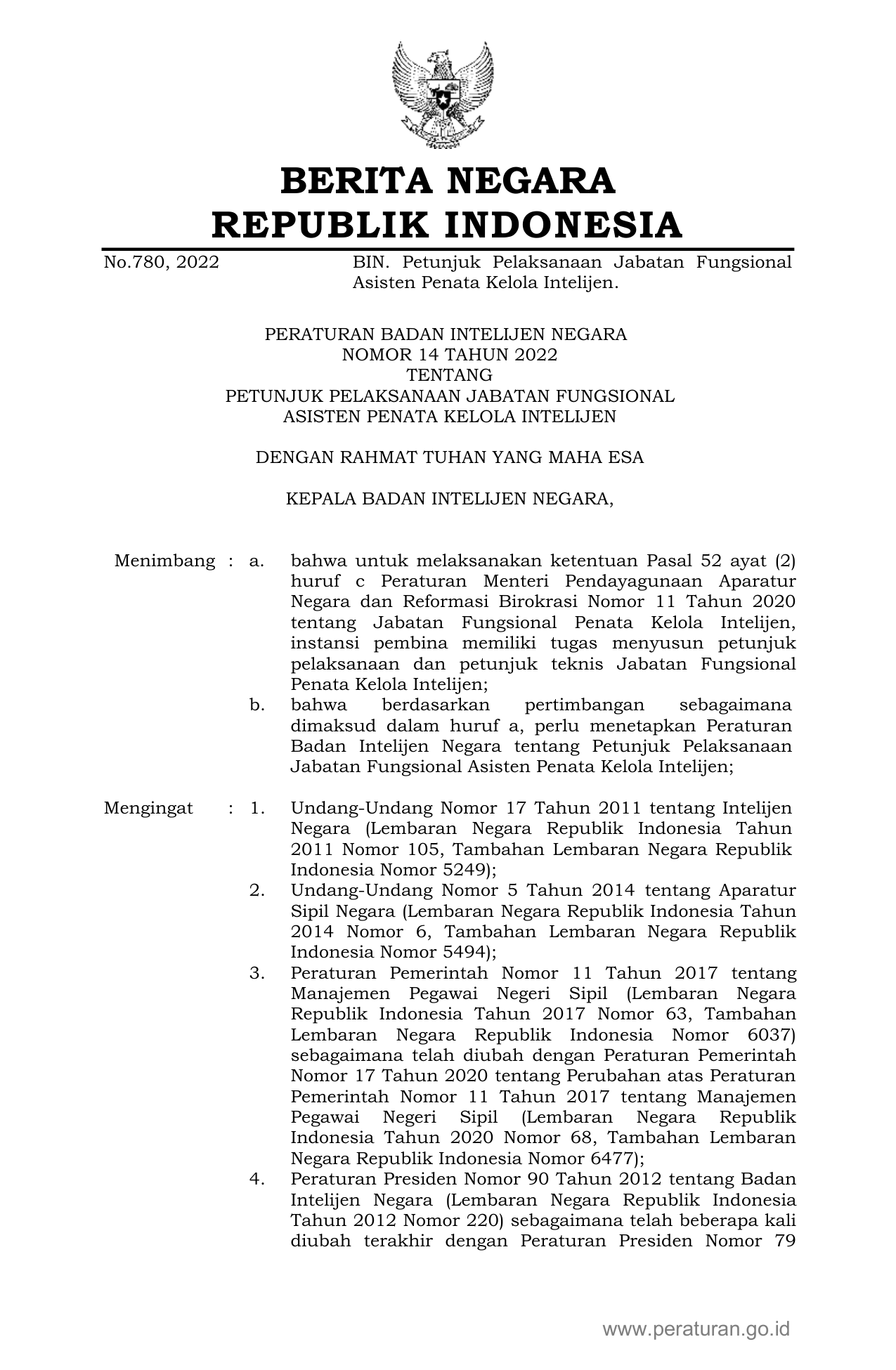 PERBAN Nomor 14 Tahun 2022 | Peraturan Badan Nomor 14 Tahun 2022 tentang PETUNJUK PELAKSANAAN JABATAN FUNGSIONAL ASISTEN PENATA KELOLA INTELIJEN