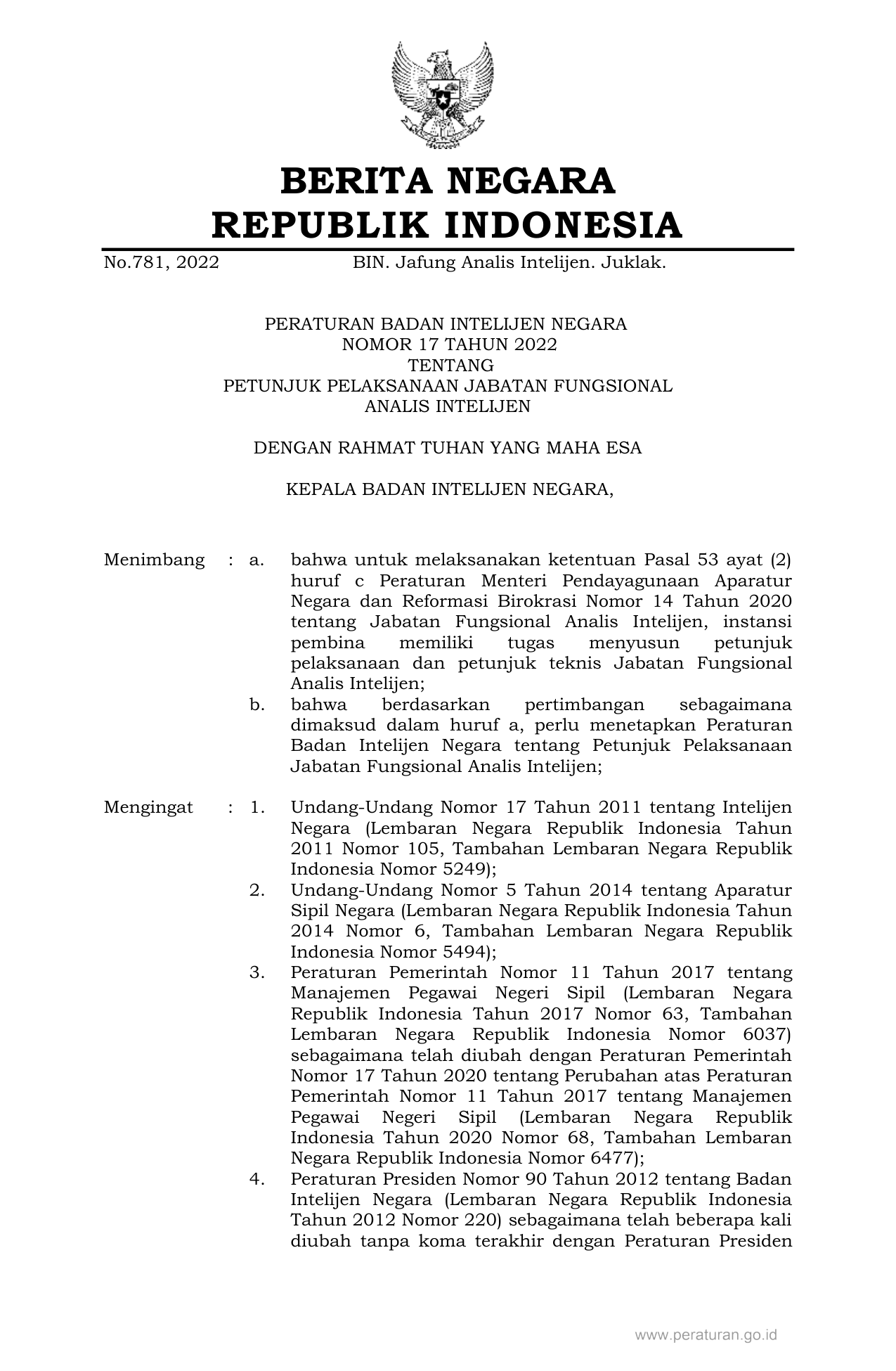 PERBAN Nomor 17 Tahun 2022 | Peraturan Badan Nomor 17 Tahun 2022 tentang PETUNJUK PELAKSANAAN JABATAN FUNGSIONAL ANALIS INTELIJEN