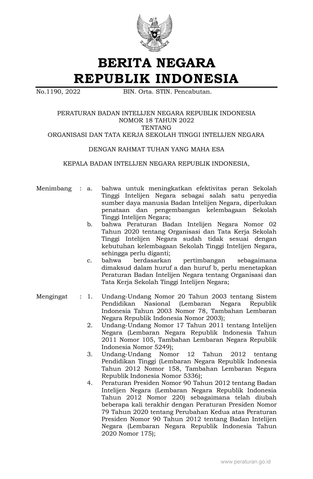 PERBAN Nomor 18 Tahun 2022 | Peraturan Badan Nomor 18 Tahun 2022 tentang ORGANISASI DAN TATA KERJA SEKOLAH TINGGI INTELIJEN NEGARA