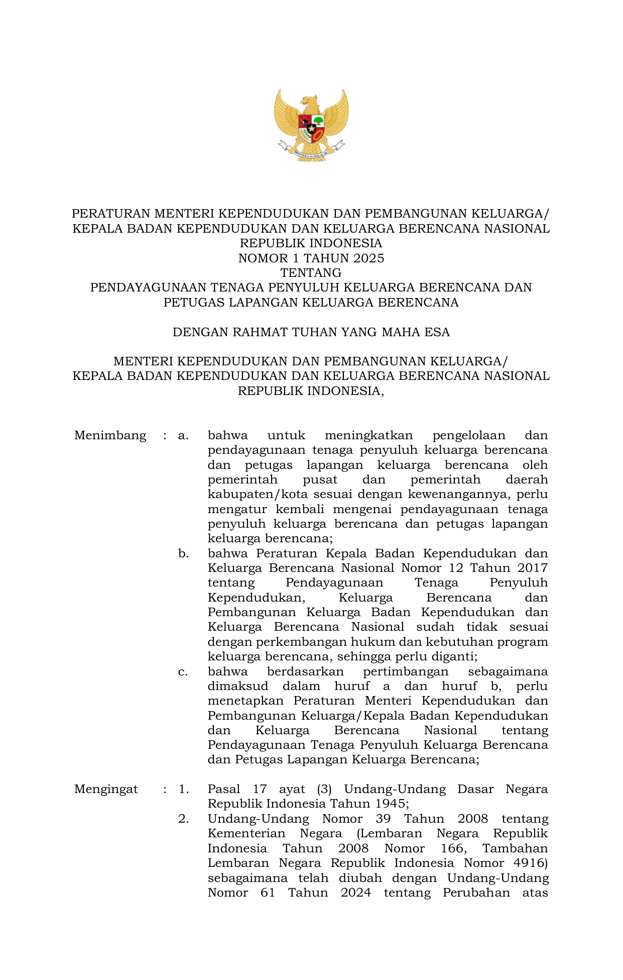 PERBAN Nomor 1 Tahun 2025 | Peraturan Badan Nomor 1 Tahun 2025 tentang PENDAYAGUNAAN TENAGA PENYULUH KELUARGA BERENCANA DAN PETUGAS LAPANGAN KELUARGA BERENCANA