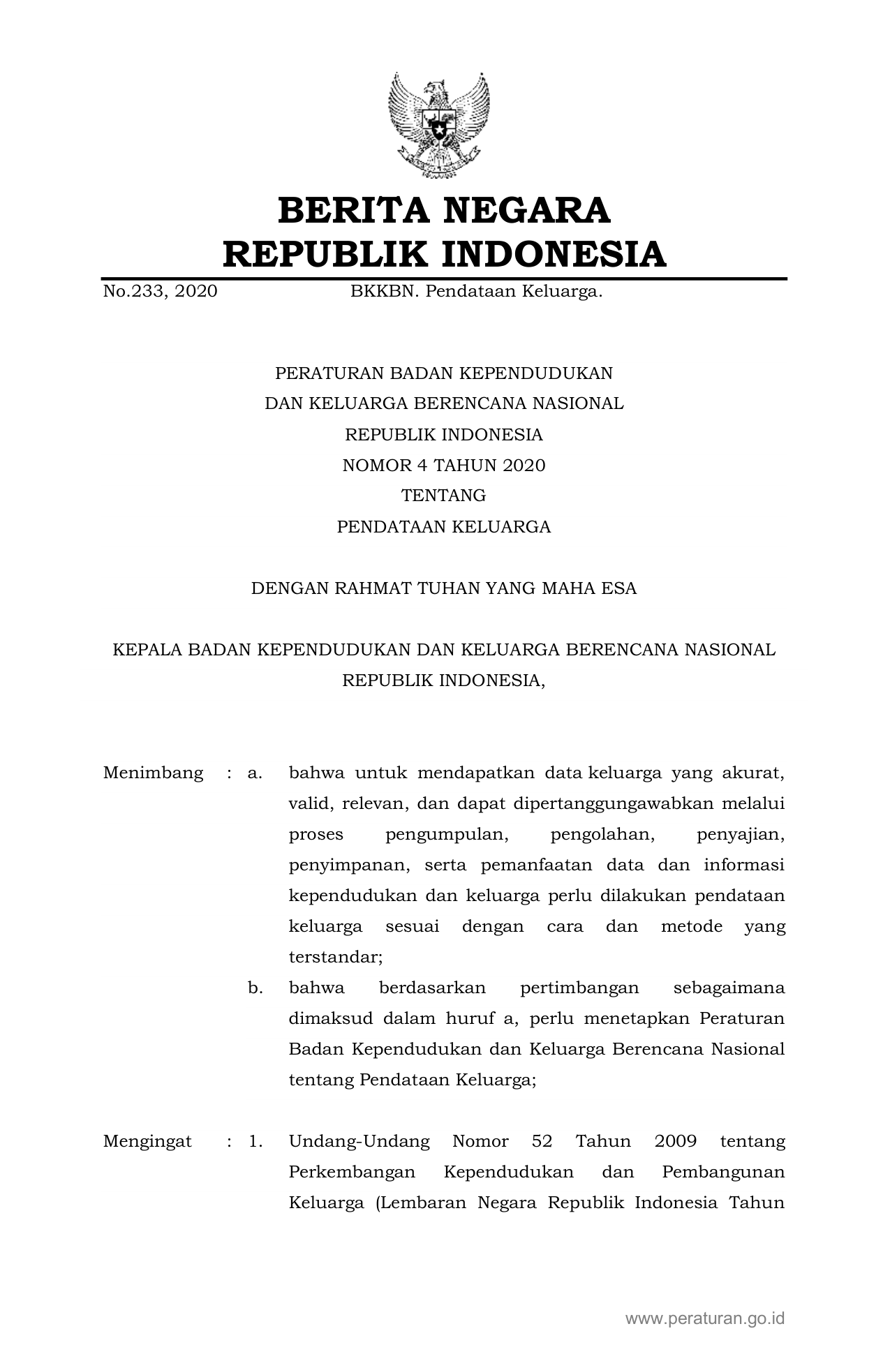 PERBAN Nomor 4 Tahun 2020 | Peraturan Badan Nomor 4 Tahun 2020 tentang PENDATAAN KELUARGA