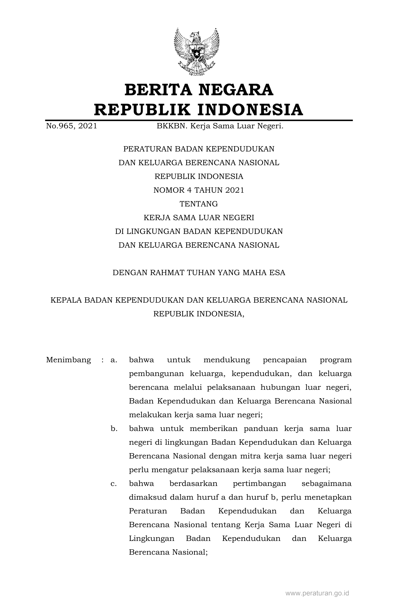 PERBAN Nomor 4 Tahun 2021 | Peraturan Badan Nomor 4 Tahun 2021 tentang KERJA SAMA LUAR NEGERI DI LINGKUNGAN BADAN KEPENDUDUKAN DAN KELUARGA BERENCANA NASIONAL