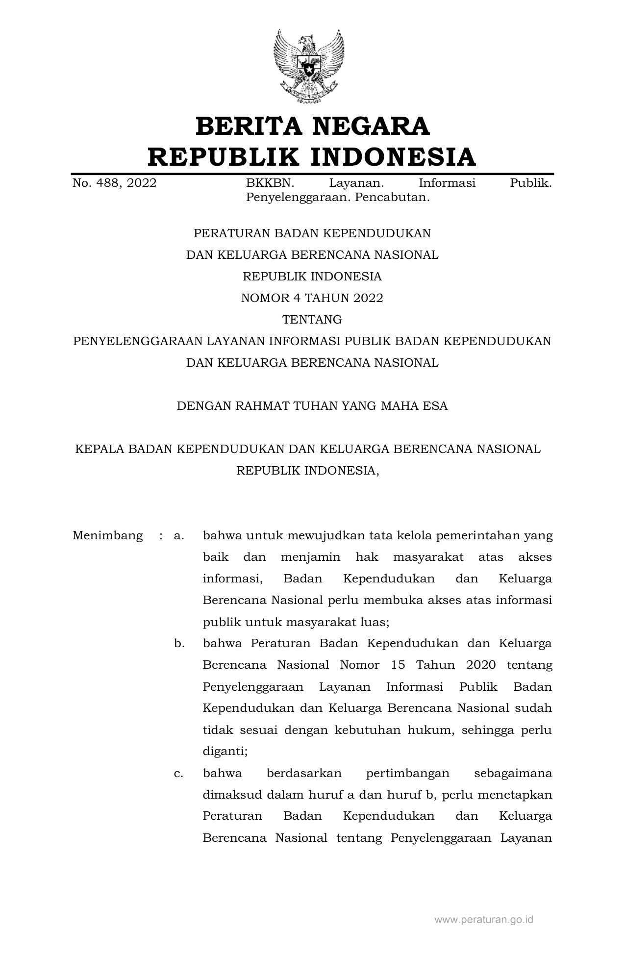 PERBAN Nomor 4 Tahun 2022 | Peraturan Badan Nomor 4 Tahun 2022 tentang PENYELENGGARAAN LAYANAN INFORMASI PUBLIK BADAN KEPENDUDUKAN DAN KELUARGA BERENCANA NASIONAL