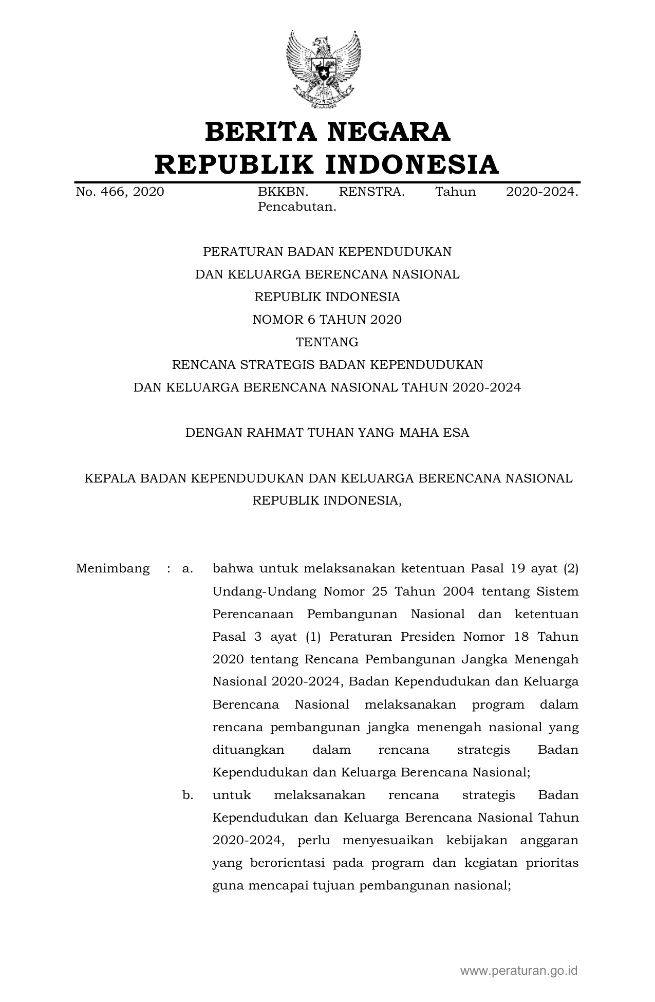 PERBAN Nomor 6 Tahun 2020 | Peraturan Badan Nomor 6 Tahun 2020 tentang RENCANA STRATEGIS BADAN KEPENDUDUKAN DAN KELUARGA BERENCANA NASIONAL TAHUN 2020-2024
