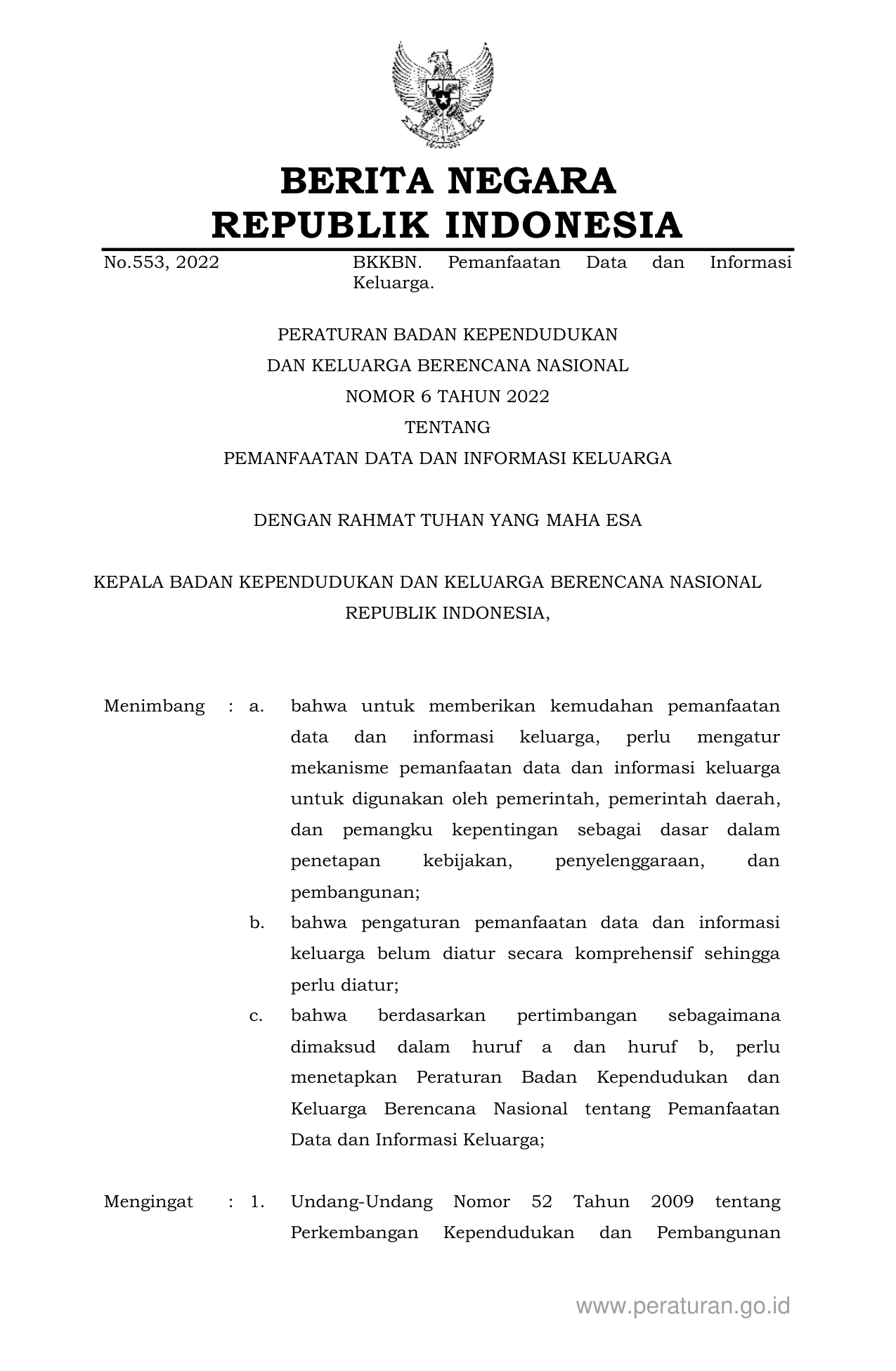 PERBAN Nomor 6 Tahun 2022 | Peraturan Badan Nomor 6 Tahun 2022 tentang PEMANFAATAN DATA DAN INFORMASI KELUARGA